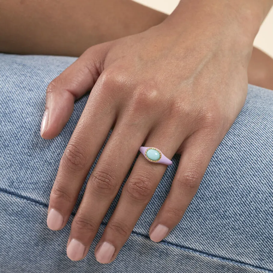 Bague fine, en laiton doré 750/1000, émaillée avec une pierre naturelle au centre.