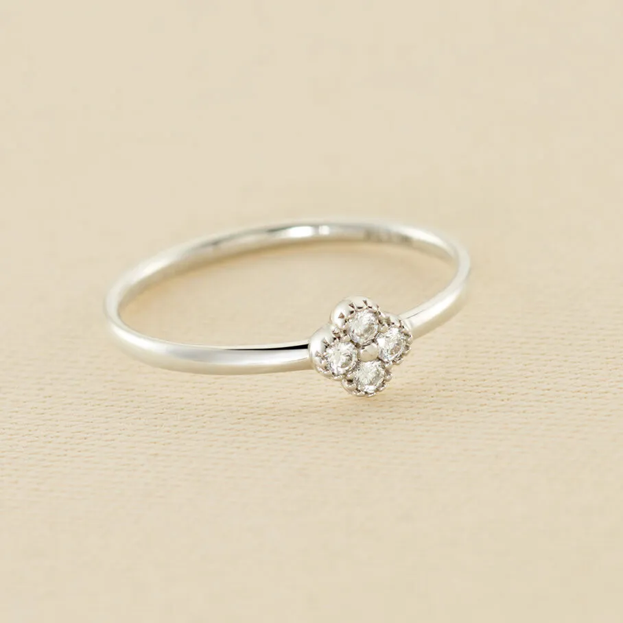 Bague, en argent véritable, montée d’une fleur d’oxyde de zirconium dont le pourtour est réalisé avec un fin graineti