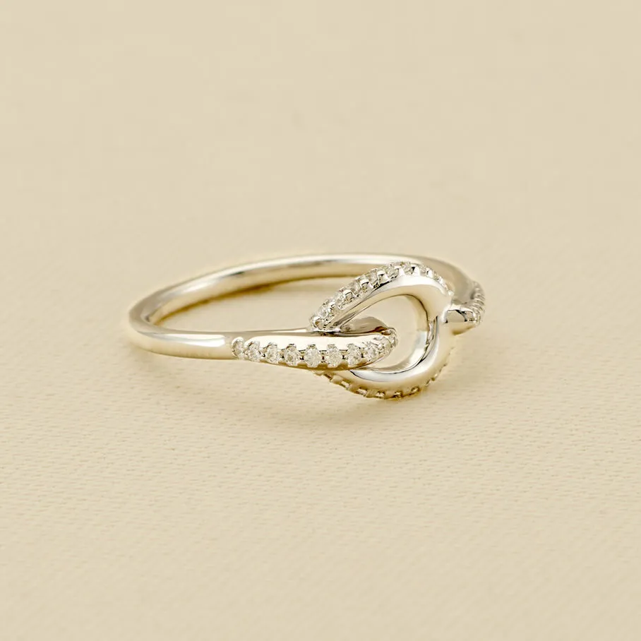 Bague, en argent véritable 925/1000, dont le motif représente deux gouttes entrelacées. L’une des gouttes sertie finement d’oxydes de zirconium évoque subtilement le reflet d’une goutte de pluie fraichement tombée