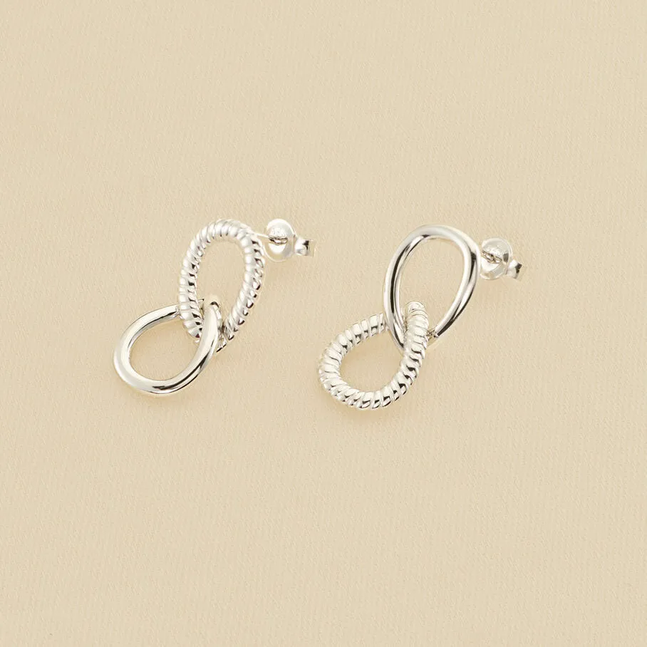 Boucles d’oreilles mi-longues, en argent véritable, constituées de deux gouttes entrelacées dont l’une est torsadée et l’autre lisse