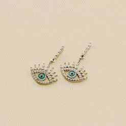 Boucles d’oreilles mi-longues, en argent véritable 925/1000 et dorées 750/1000, dont le pendentif est un œil turc. L’iris émaillé et le contour de l’œil serti d’oxydes de zirconium apportent un vrai raffinement et éclat au produit!