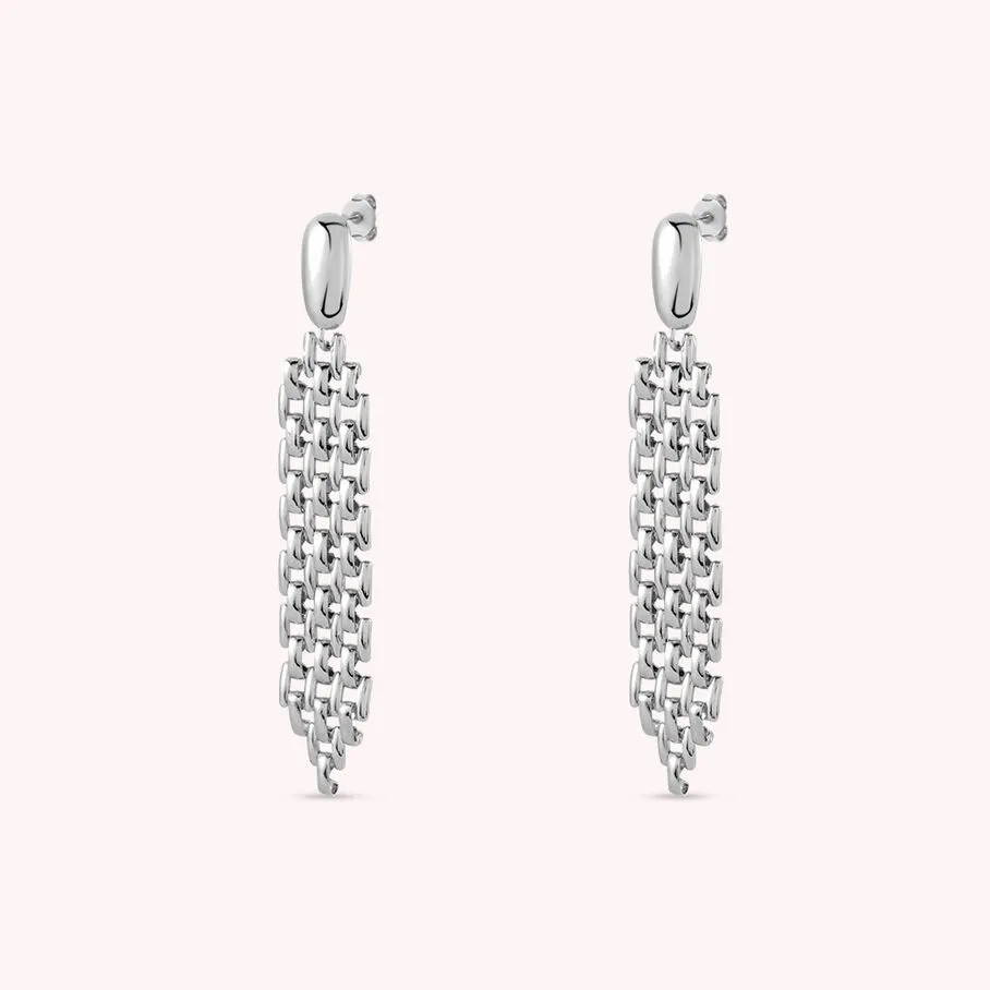 Boucles d’oreilles longues, en laiton et étain, dont la maille ressemble à une maille de montre