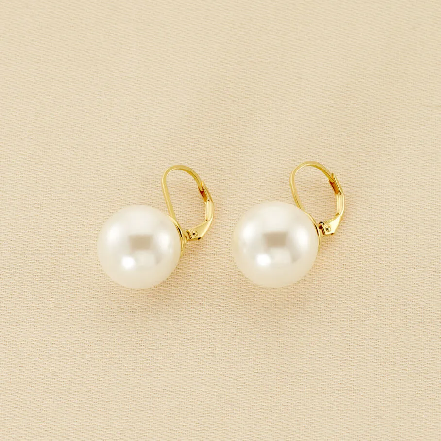 Boucles d’oreilles dormeuses en argent véritable dorées 750/1000, ornées de perles de verre de 14 mm de diamètre