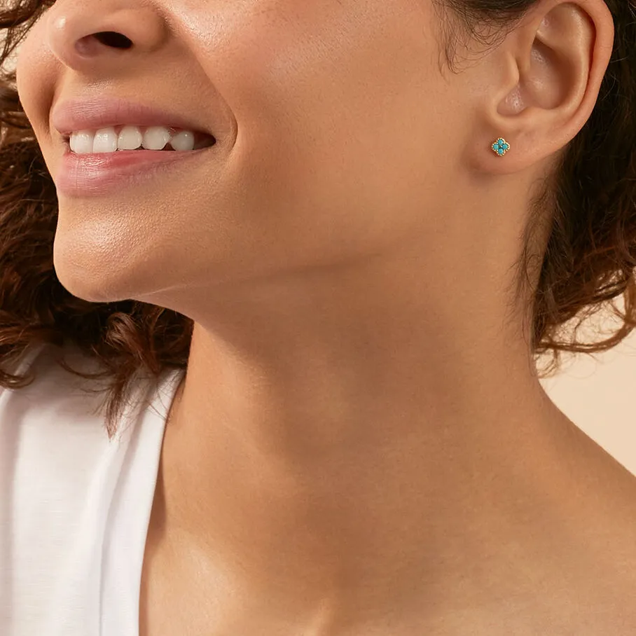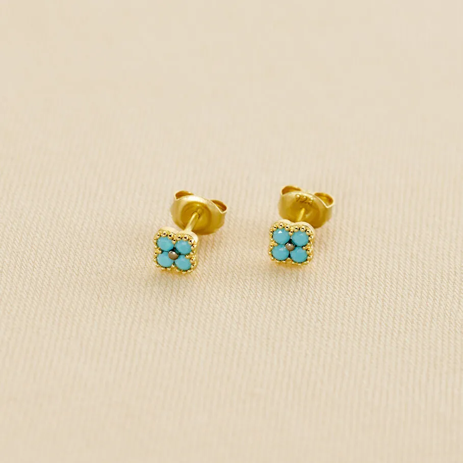 Boucles d’oreilles puces, en argent véritable finement doré 750/1000, en forme de fleur; dont les pétales sont pavés d’oxyde de zirconium et le pourtour réalisé avec un fin graineti