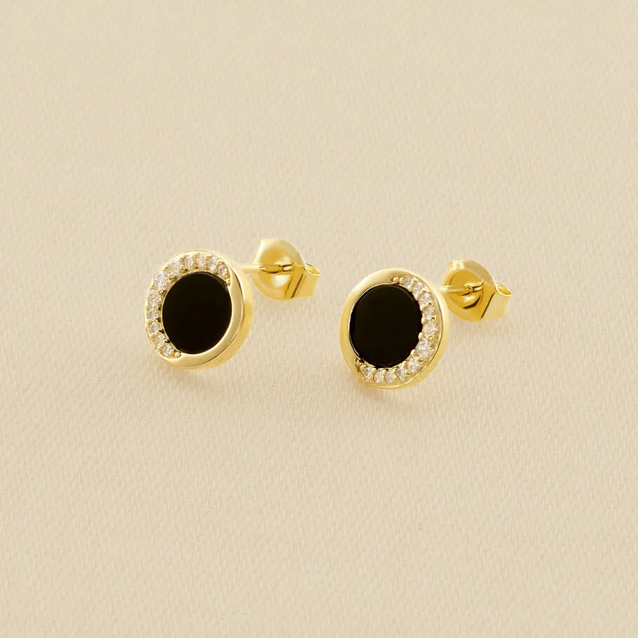 Boucles d’oreilles puces, en argent véritable doré 750/1000, ornées d’une pastille en onyx et d’un motif lune serti d’oxydes de zirconium