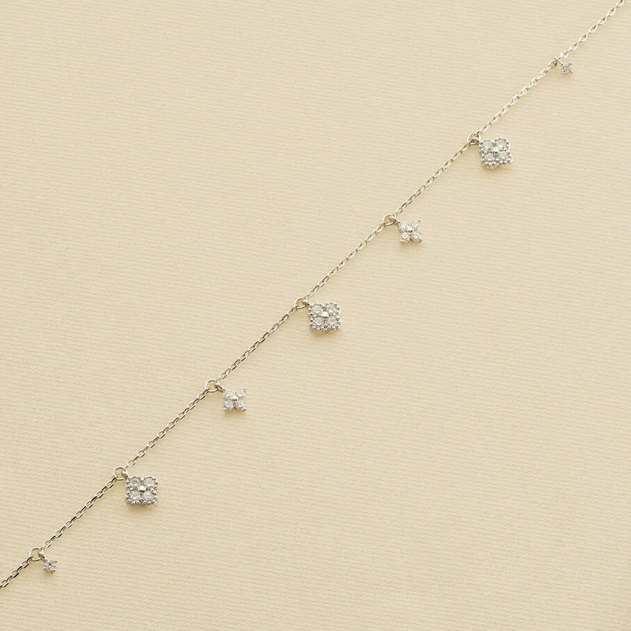 Bracelet chaine, en argent véritable, avec des fleurs d’oxydes de zirconium en pampille et un fin graineti sur le pourtour