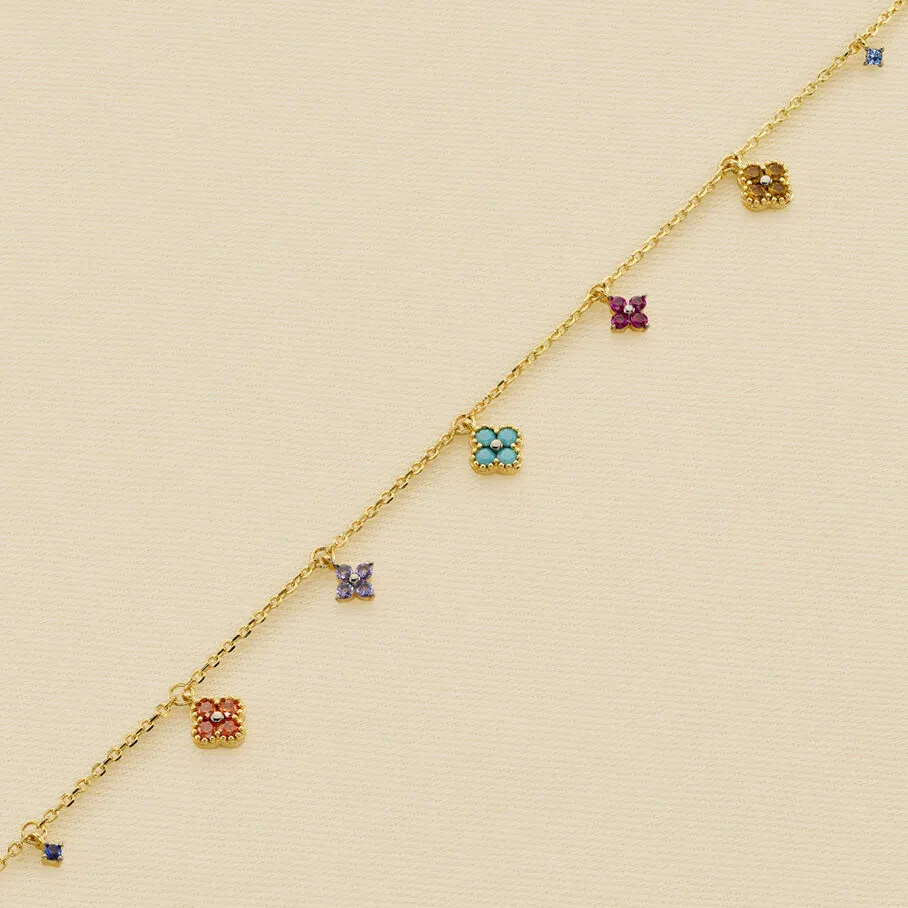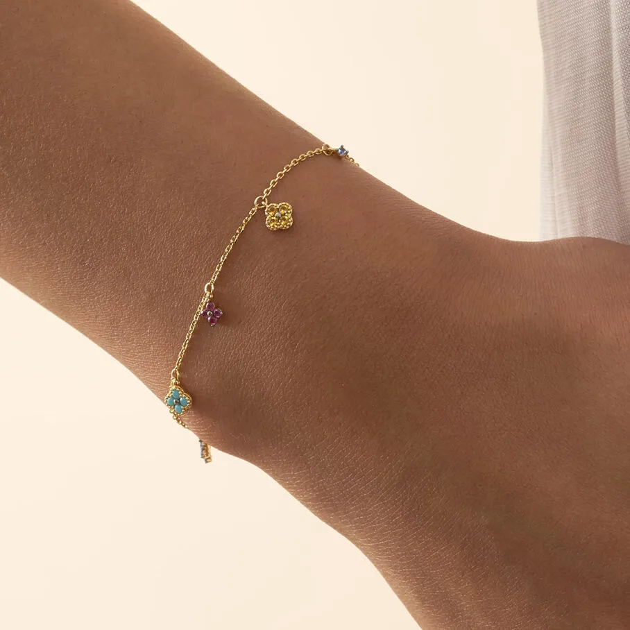Bracelet chaine, en argent véritable doré 750/1000, avec des fleurs d’oxydes de zirconium en pampille et un fin graineti sur le pourtour