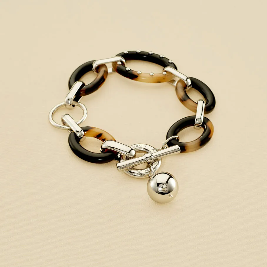 Bracelet en laiton doré 750/1000, avec des maillons ovales en acetate et une boule en métal, fermoir T-bar
