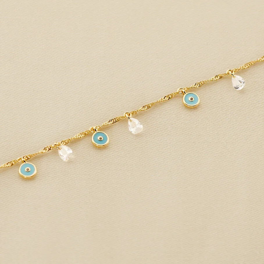 Bracelet, en laiton doré à l’or fin, avec des pampilles d’oeils turcs plats turquoises et des oxydes perçés