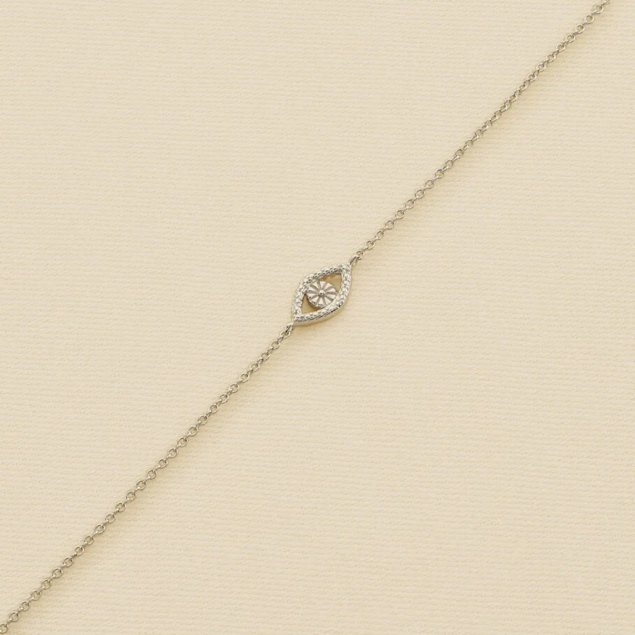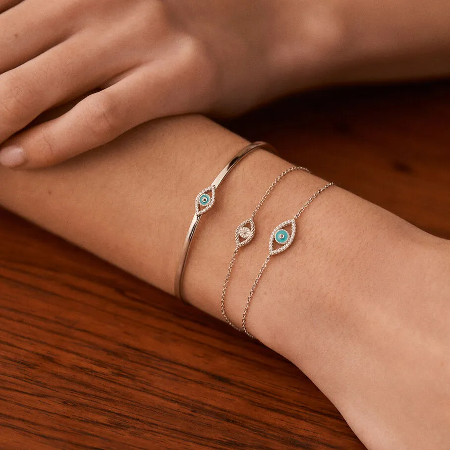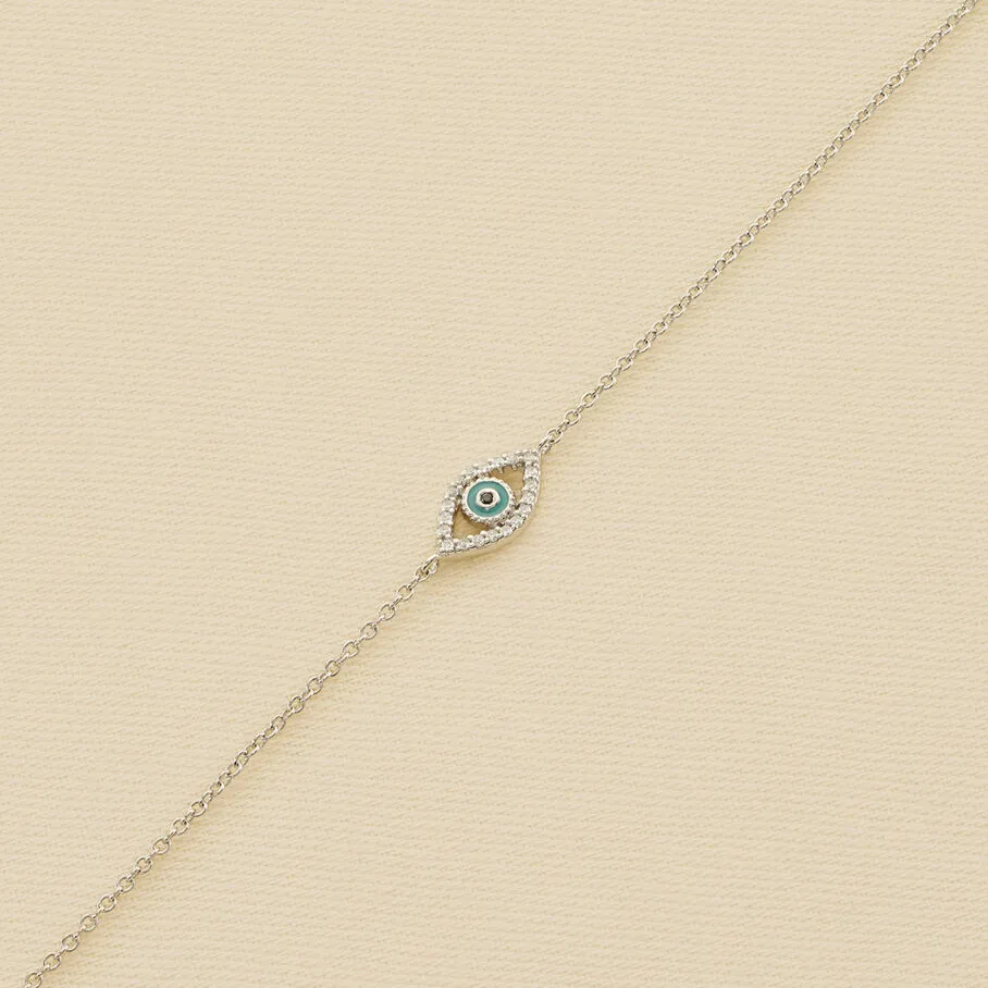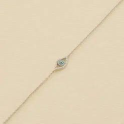 Bracelet, en argent véritable 925/1000, dont la chaine est ornée d’un petit œil turc. L’iris émaillé et le contour de l’œil serti d’oxydes de zirconium apportent un vrai raffinement et éclat au produit!