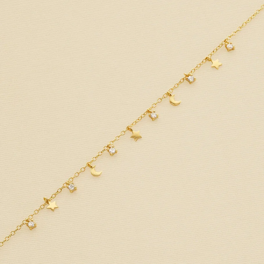Bracelet, en argent véritable doré 750/1000, avec en pampille des petites lunes et des petites étoiles