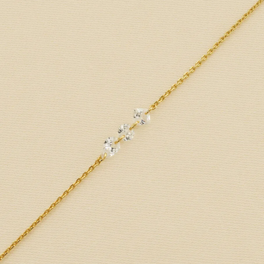 Bracelet fin, en argent véritable doré 750/1000, avec une trilogie d’oxydes de zirconium percés en formes de poire, rond et coussin