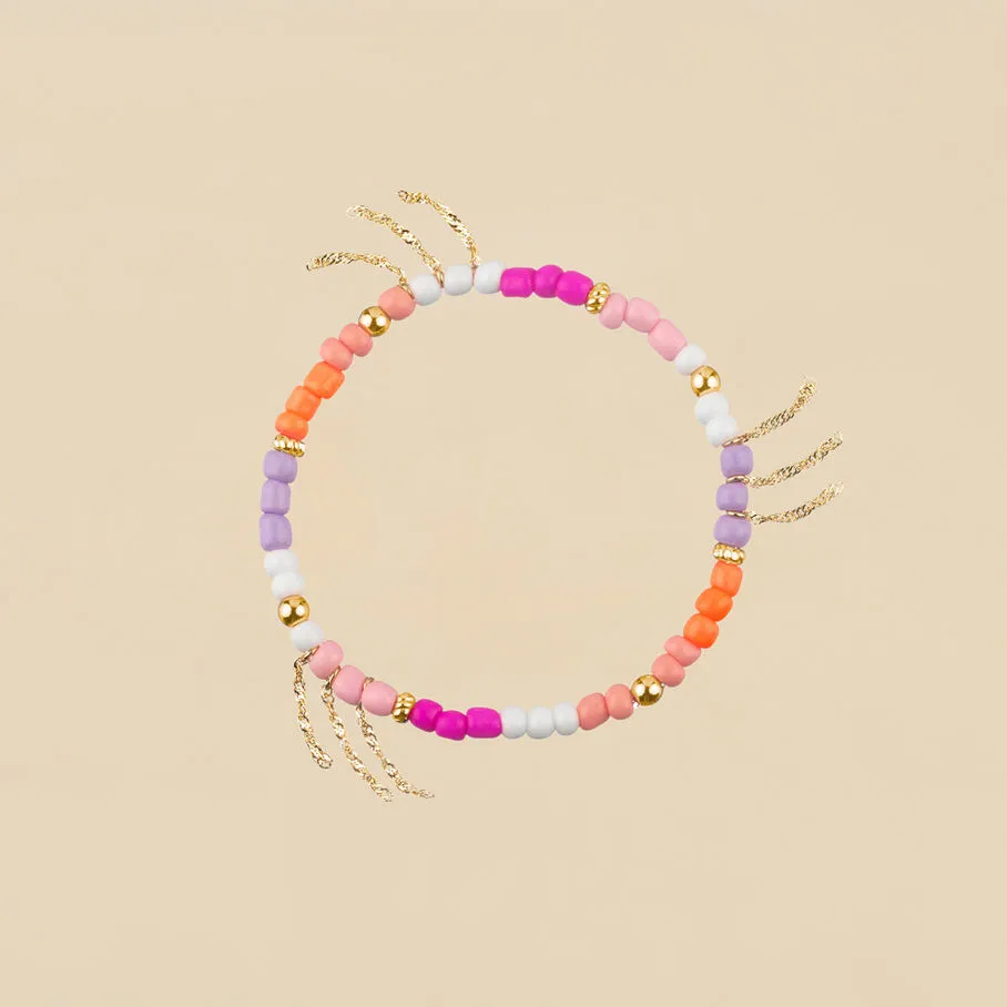 Bracelet elastique, en laiton doré 750/1000, perles de verre enfilées et pompons de chaines