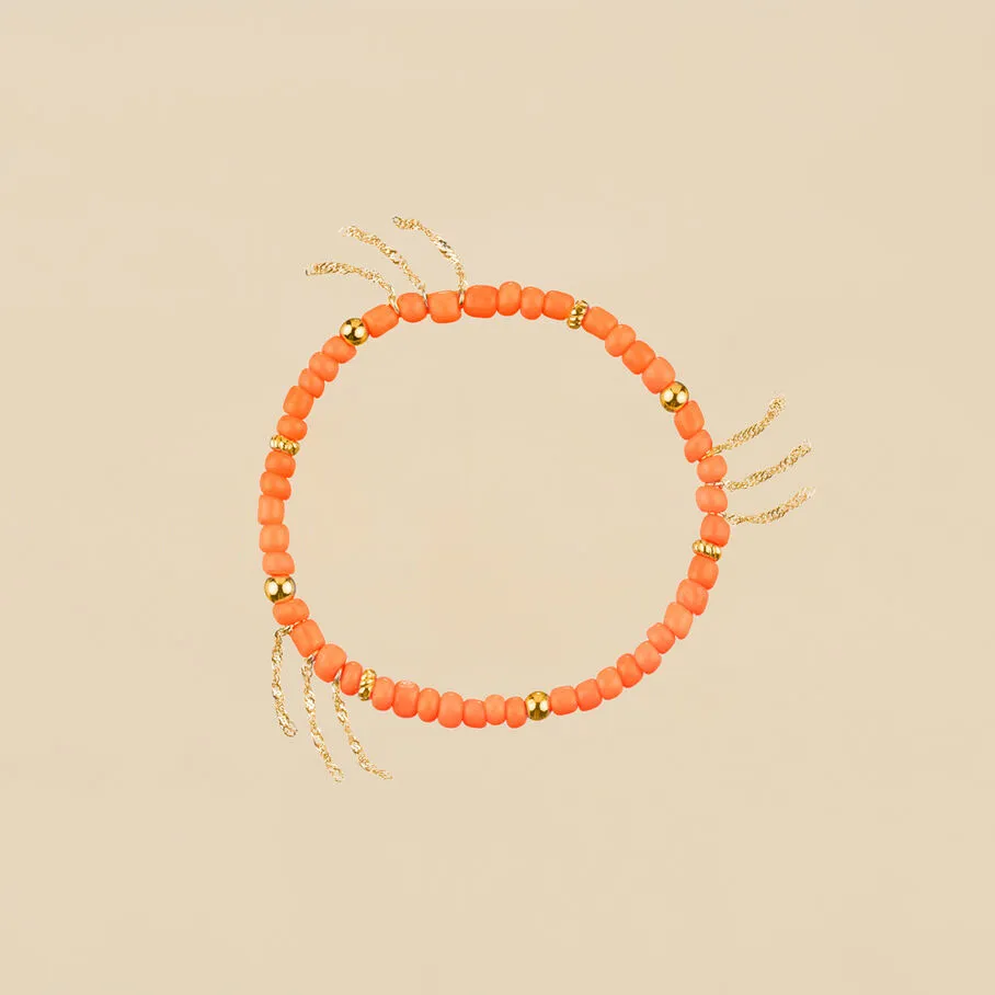 Bracelet elastique, en laiton doré 750/1000, perles de verre enfilées et pompons de chaines
