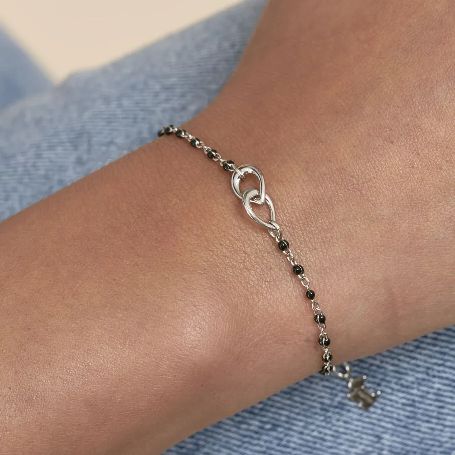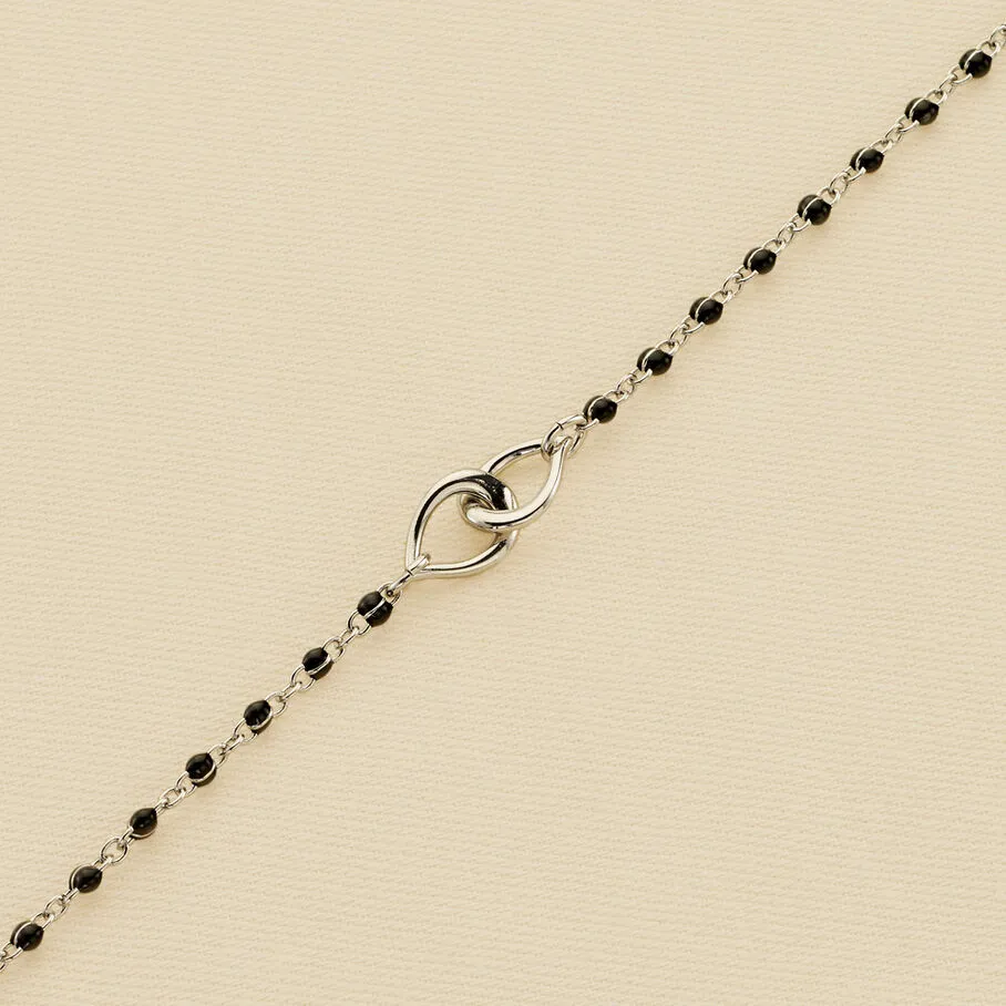 Bracelet, en laiton rhodié, perles d’émail sur chaine et deux anneaux gouttes entrelacés