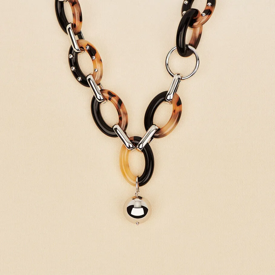 Collier mi-long en laiton doré 750/1000, maillons ovales en acetate et boule métal en pampille, fermoir T-bar.Ces chaines amovibles offrent un multiporté : en coller mi long, en collier Y ou en collier court assorti d’un bracelet.
