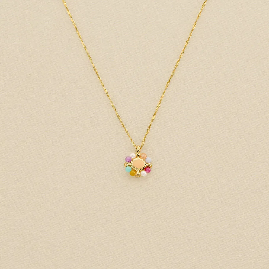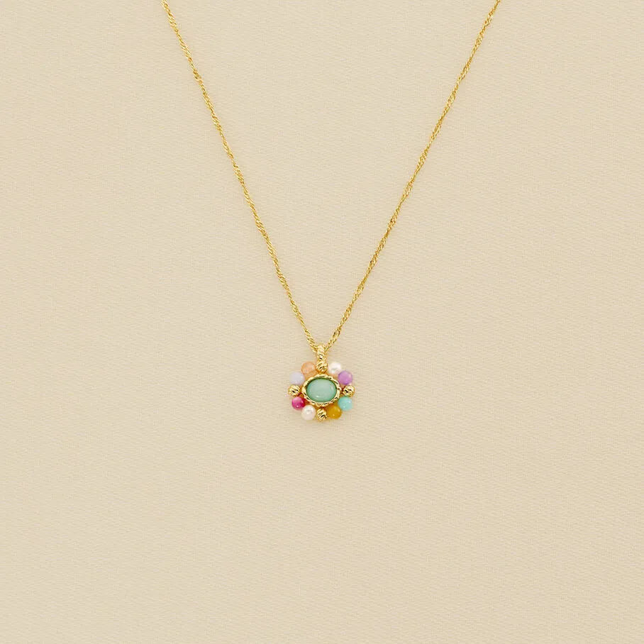 Collier court en laiton doré 750/1000, avec une pierre naturelle entournée de minis pierres colorées sur chaîne.
