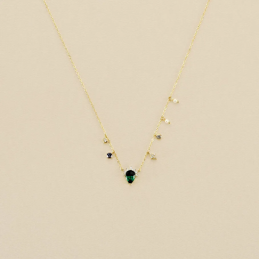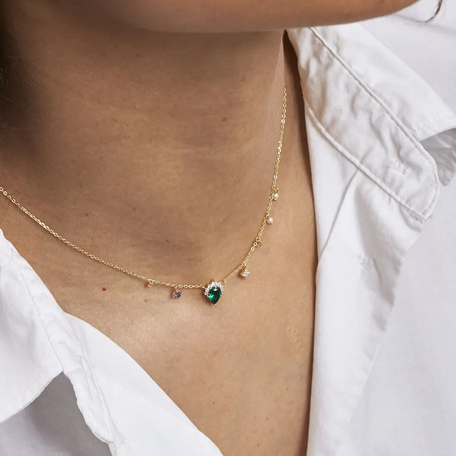 Collier chaine, en argent véritable doré 750/1000, avec un oxyde de zirconium en forme de goutte, monté d’une couronne d’oxydes de zirconium. Les pampilles d’oxydes de zirconium et de perles donnent de la modernité à ce bijou si proche de la joaillerie de par son style