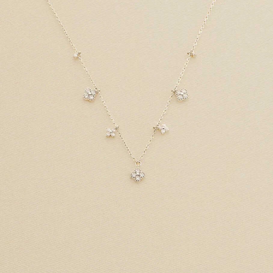 Collier court, en argent véritable, avec des fleurs d’oxydes de zirconium en pampille et un fin graineti sur le pourtour