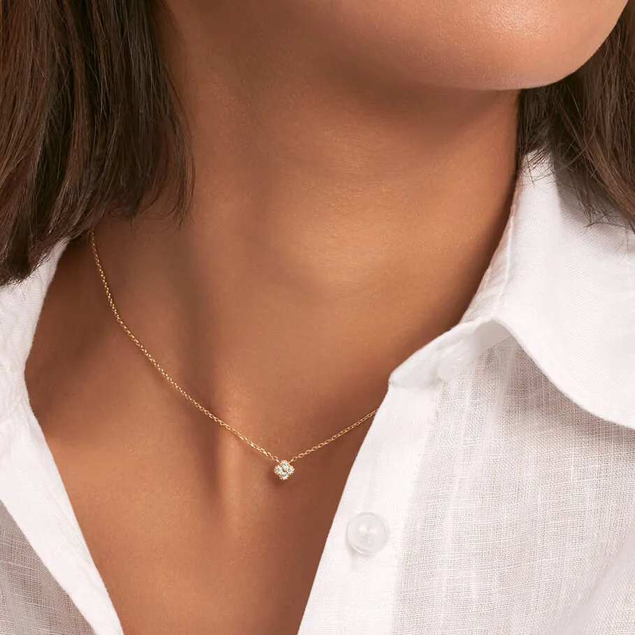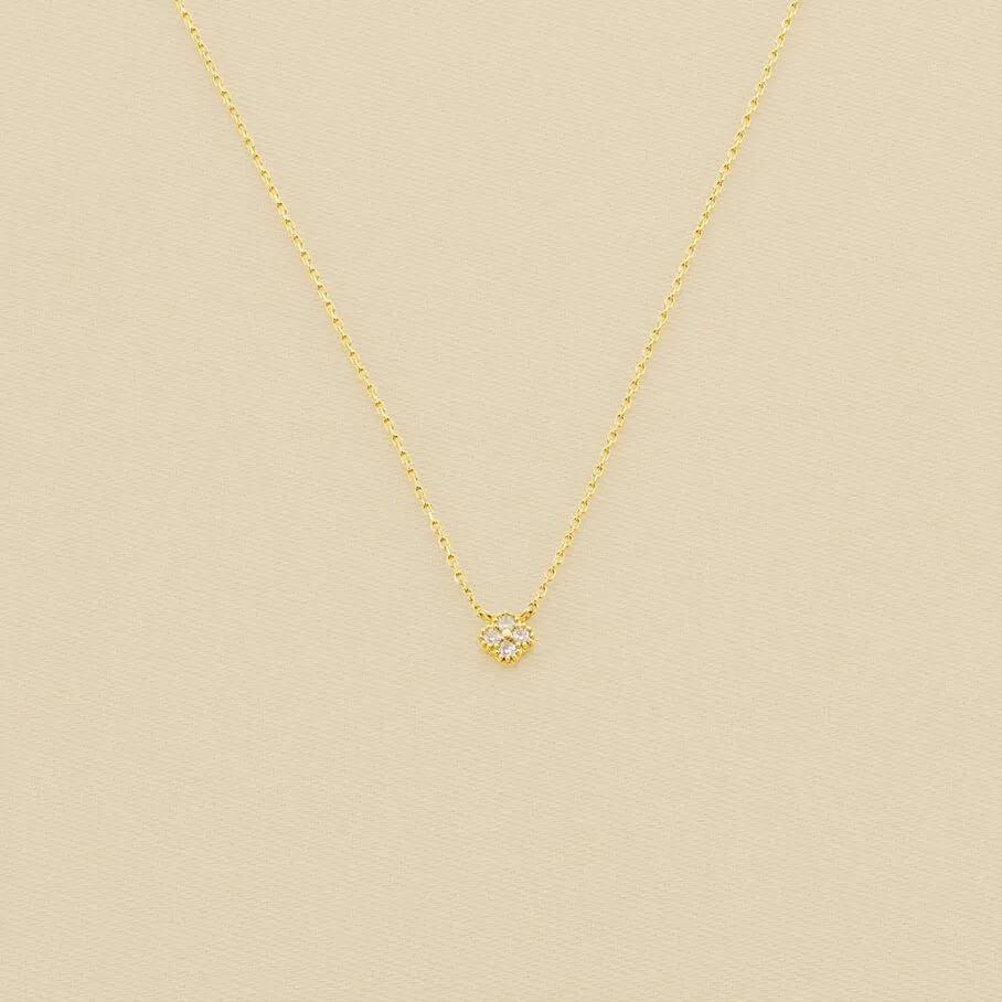 Collier, en argent véritable doré 750/1000, avec un pendentif en forme de fleur dont les pétales sont des oxydes de zirconium et dont le pourtour est finement réalisé avec un graineti