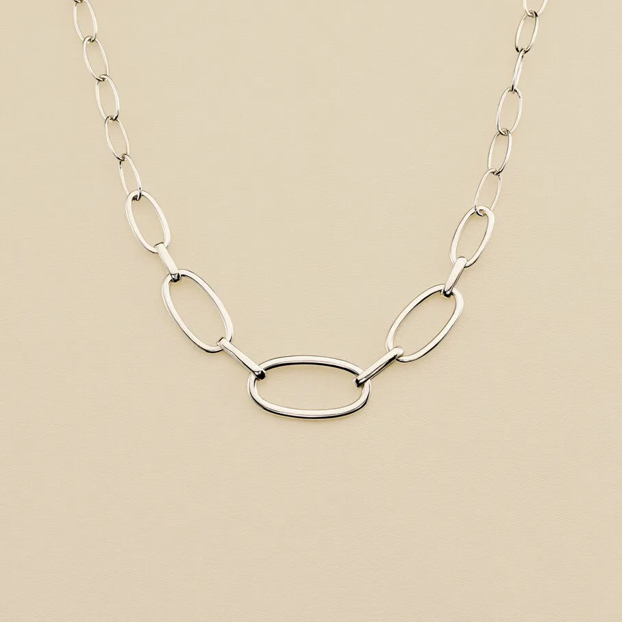Collier maillons ovales allongés de différentes tailles, dégradé sur le devant, et notre fermoir T identitaire