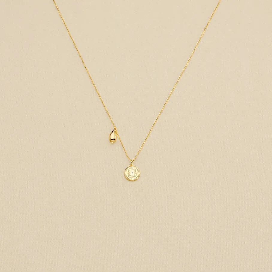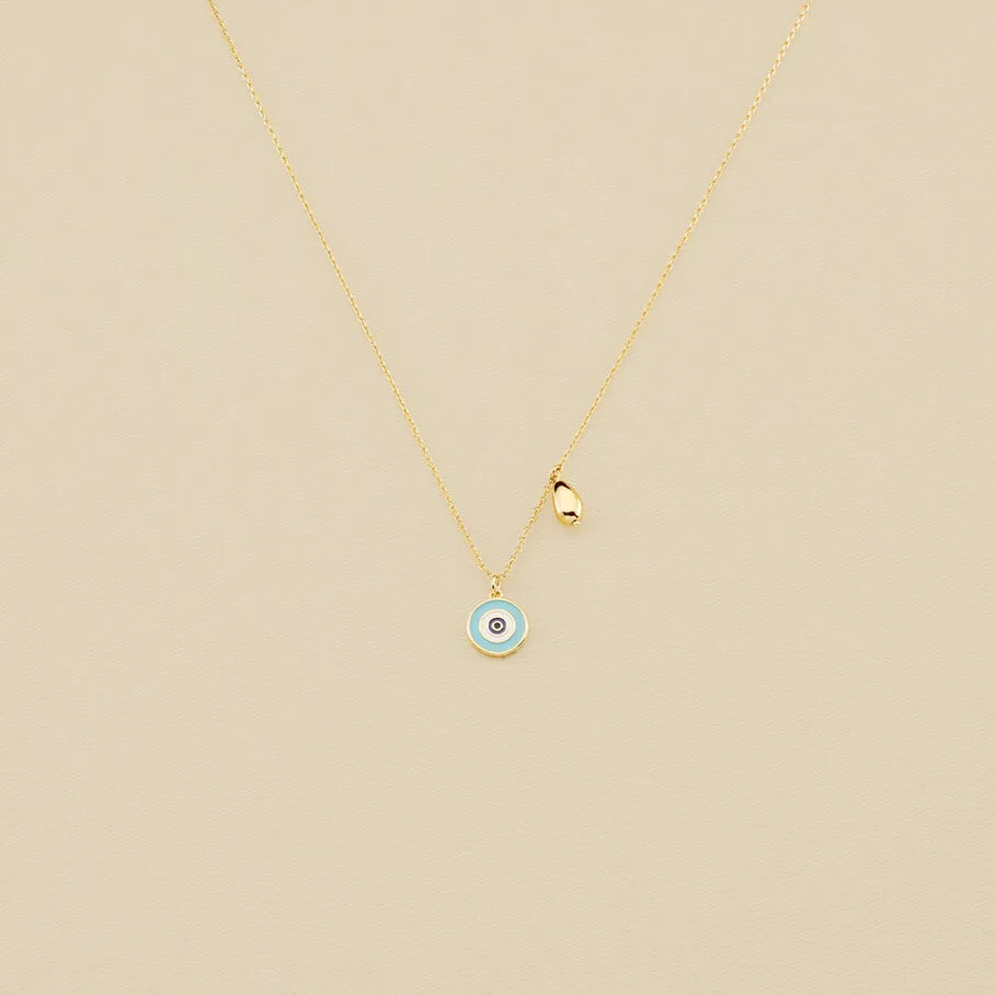 Collier court, en laiton doré à l’or fin, avec un œil turc et un coquillage sur chaine en pendentifs