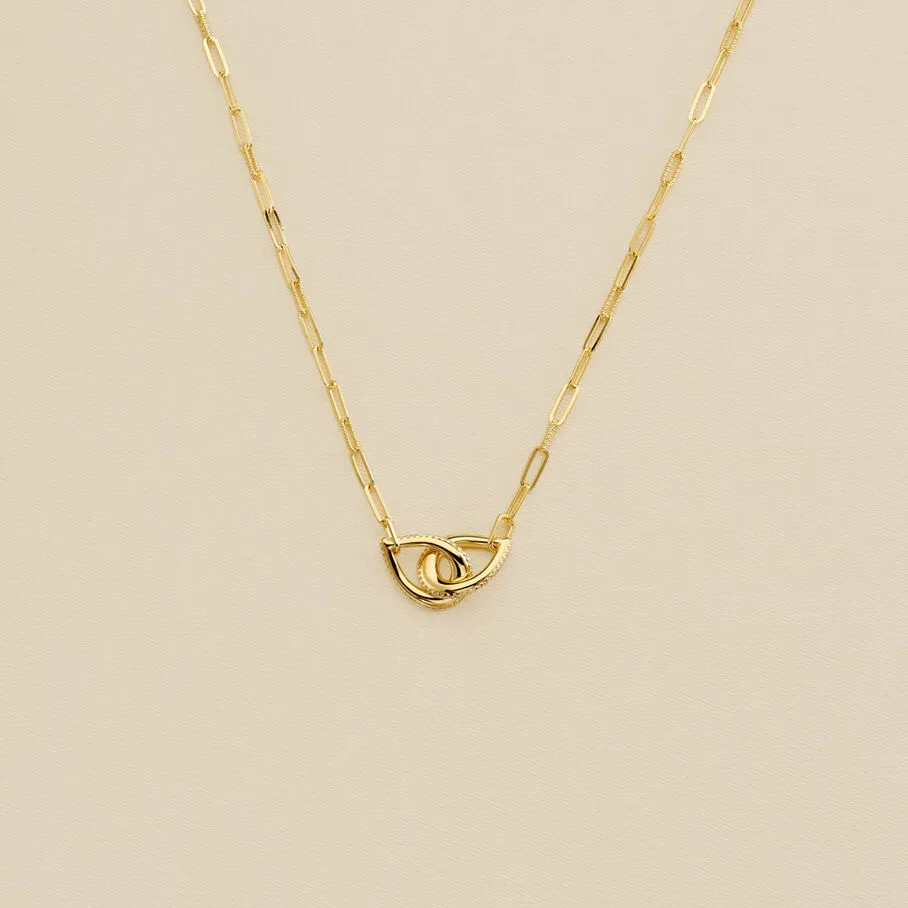 Collier, chaine maille rectangle, en argent 925/1000 et doré 750/1000, dont le prendentif représente deux gouttes entrelacées et serties d’oxydes de zirconium sur la tranche extérieure