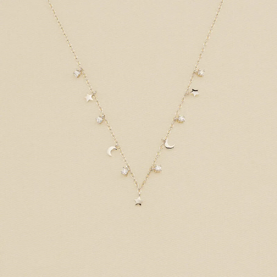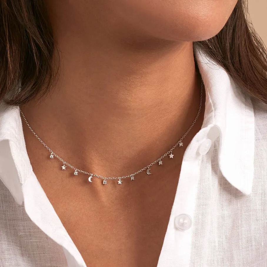 Collier court en argent véritable, multi pampilles lunes, étoiles et oxydes de zirconium griffés