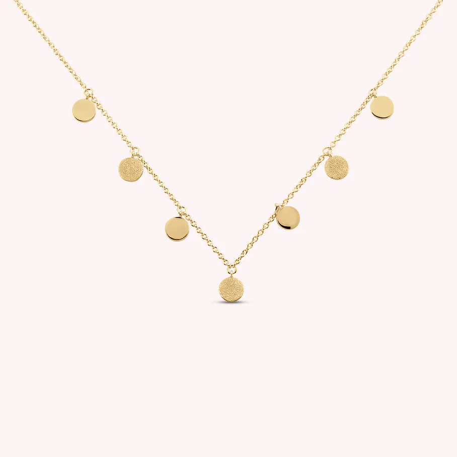 Collier court, en laiton doré 750/1000, fait de pastilles en pampille avec des finitions alternant entre un effet sablé brillant et un effet lisse