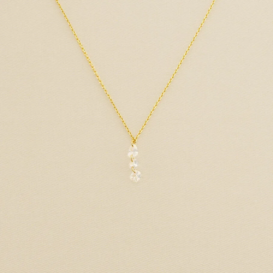 Collier court, en argent véritable doré à’ l’or fin, avec un pendentif fait d’une trilogie d’oxydes de zirconium percés en forme de poire, rond et coussin