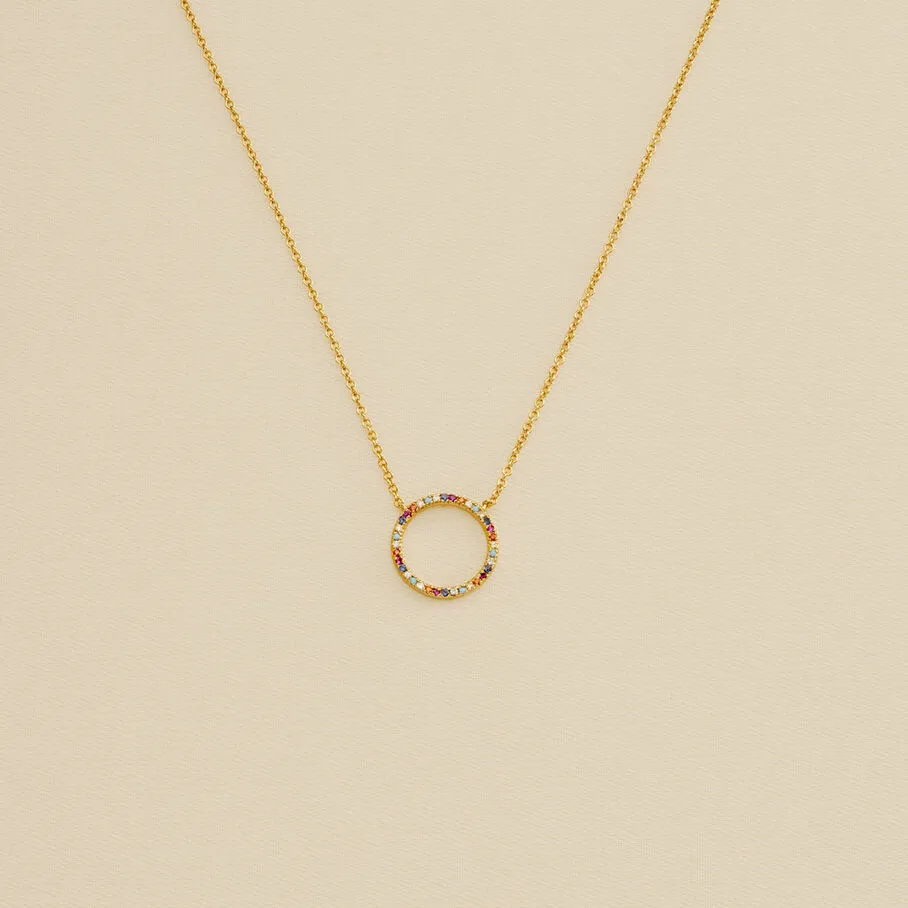 Collier court en argent véritable doré 750/1000 orné d’un cercle serti d’oxydes de zirconium multicolores et de turquoise reconstituée