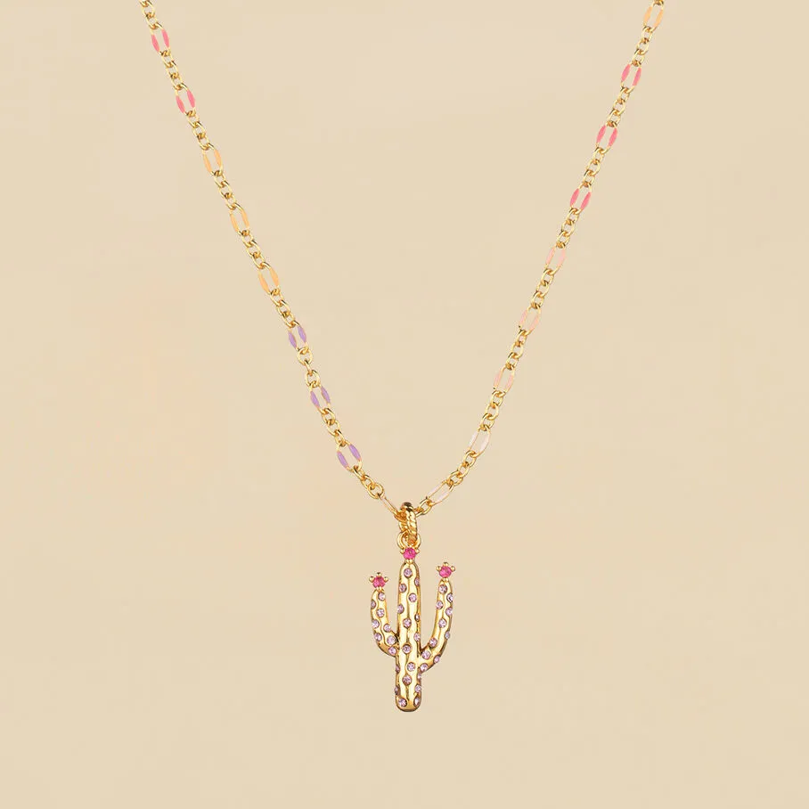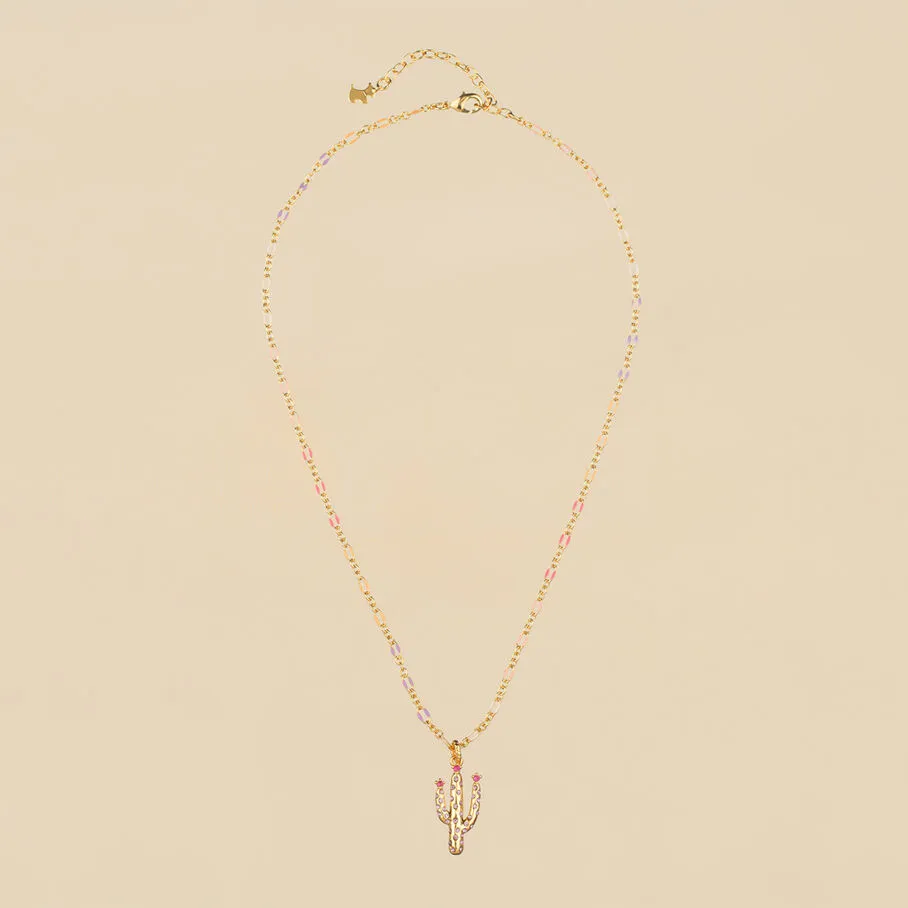 Collier court, en laiton doré 750/1000, chaine émaillée et cactus en pendentif avec 3 oxydes de zirconium