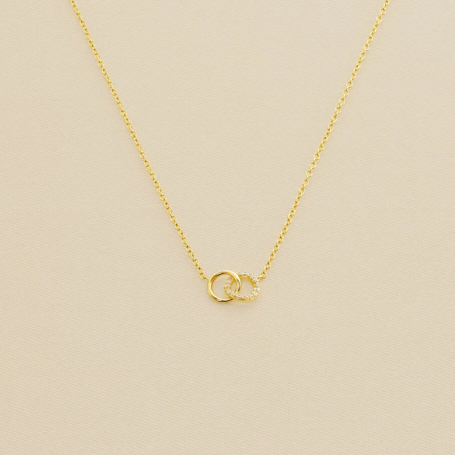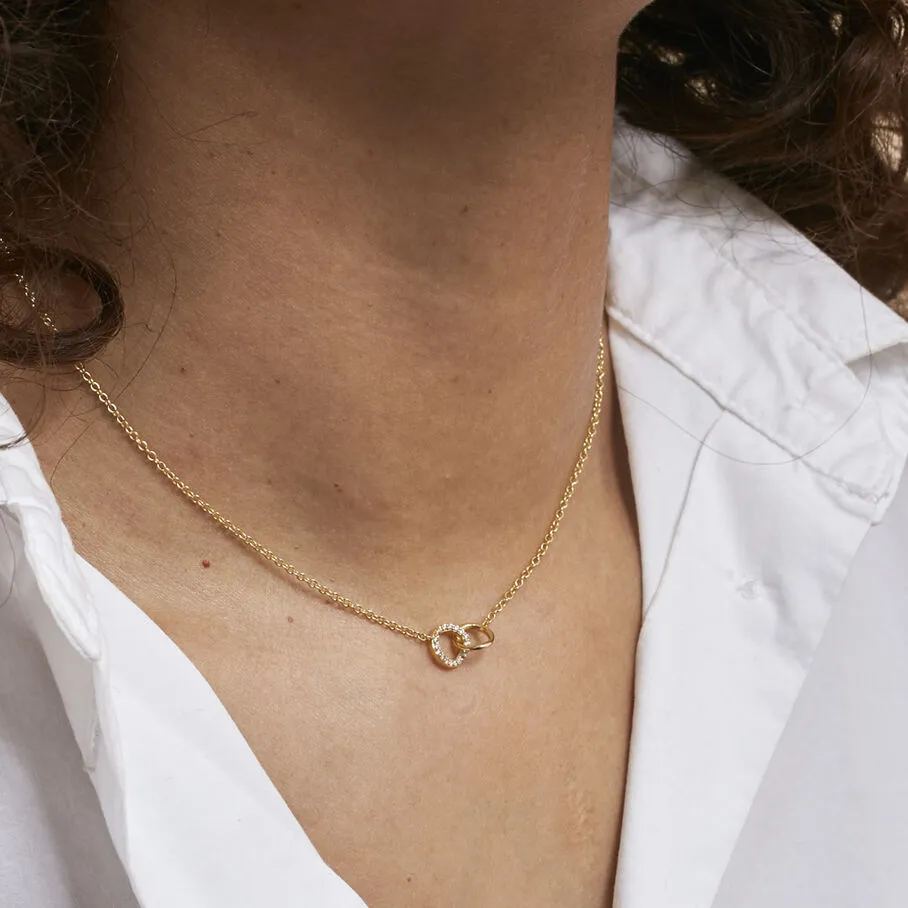 Collier court en argent véritable doré 750/1000, orné de deux anneaux entrelacés dont un pavé d’oxydes de zirconium