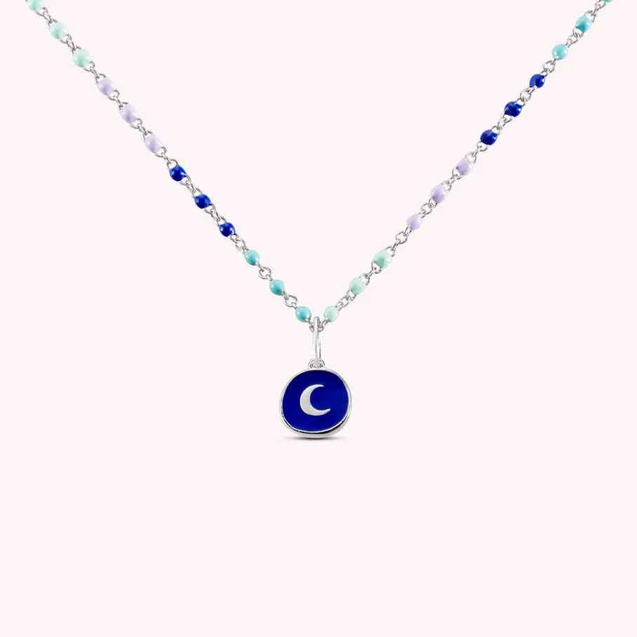 Collier court, en laiton rhodié, perles d’émail sur toute la longueur et médaille double face en pendentif