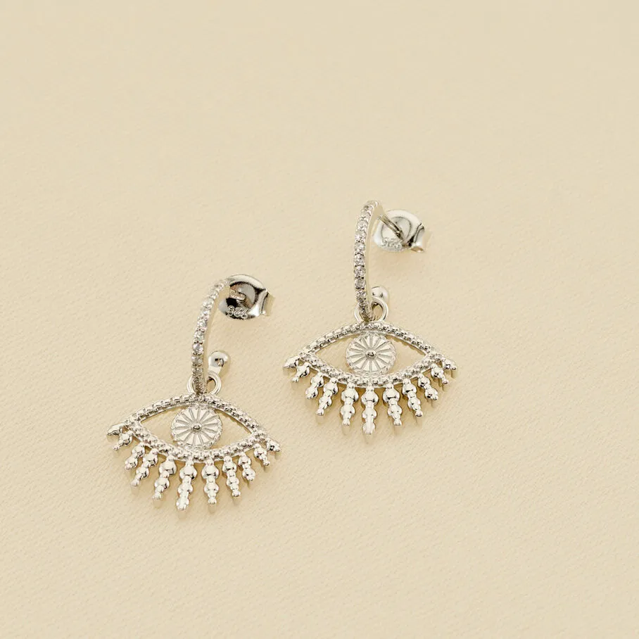 Créoles de 14mm de diamètre, en argent véritable 925/1000, sur lesquelles un œil turc a été ajouté en breloque. L’iris émaillé et le contour de l’œil serti d’oxydes de zirconium apportent un vrai raffinement et éclat au produit! Au besoin la breloque peut se retirer pour un look déparaillé ou encore un look plus simple avec de petites créoles serties d’oxydes de zirconium seulement. Des boucles d’oreilles 3 en 1 à porter au gré de vos tenues et humeur!