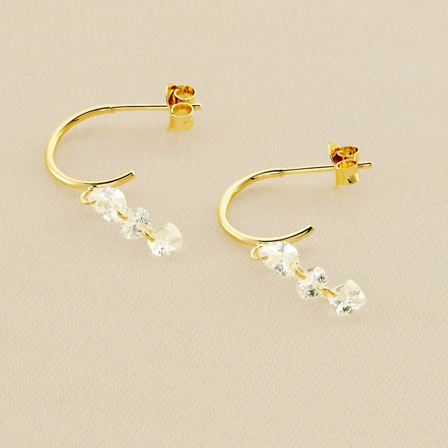 Créoles de 12 mm de diamètre, en argent véritable doré 750/1000, avec en pampille une trilogie d’oxydes de zirconium percés en formes de poire, rond et coussin
