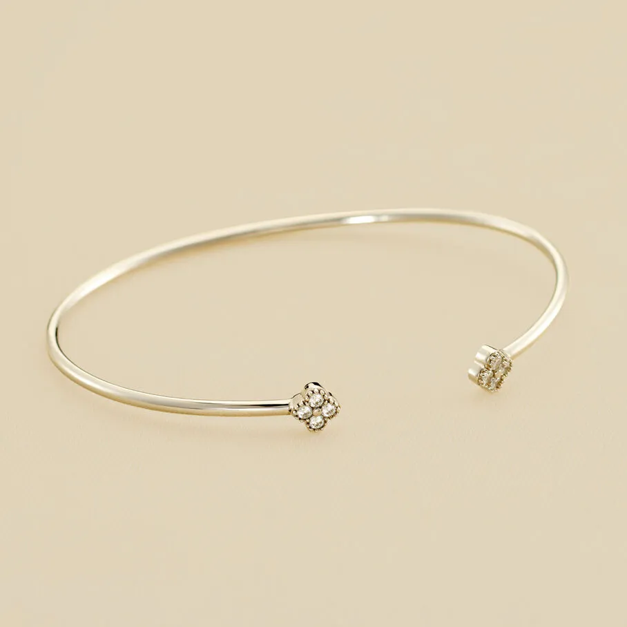 Jonc fin ouvert, en argent véritable, avec des fleurs d’oxydes de zirconium aux extrémités et un fin graineti sur le pourtour