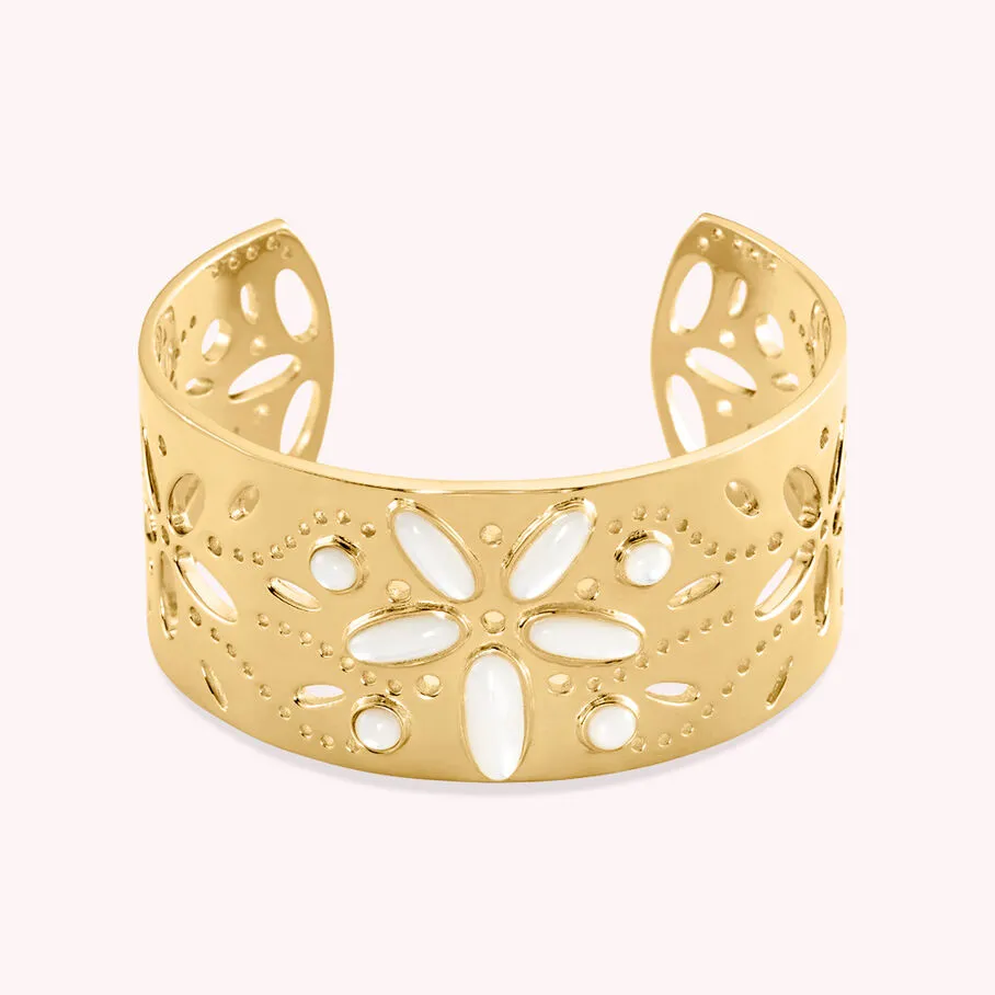 Manchette large en laiton doré 750/1000 ornée de motifs sun dollars et de nacre