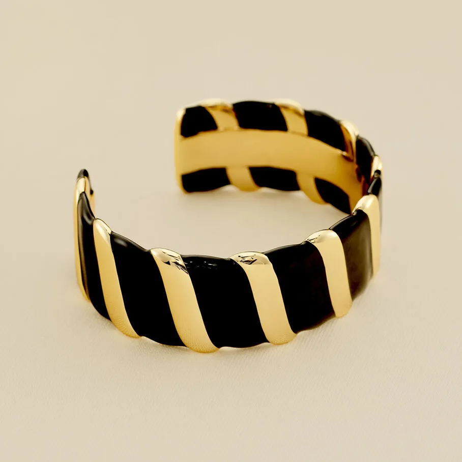 Manchette fine ouverte, en laiton doré, effet torsadé en émail