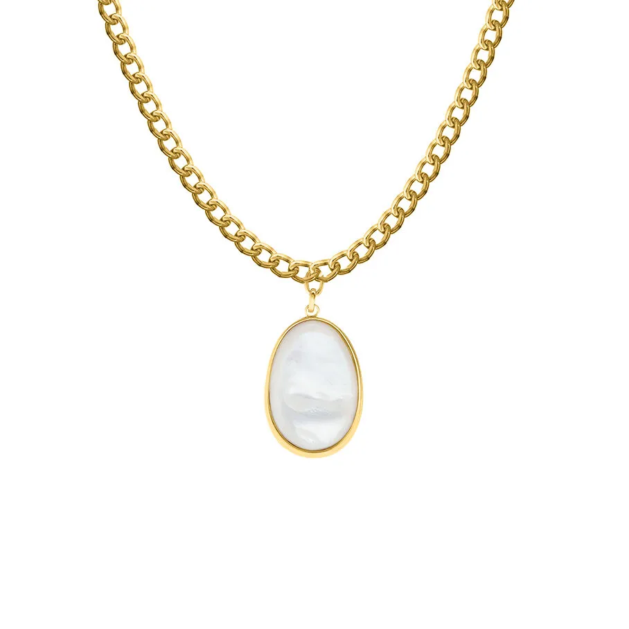 Collier long en laiton doré 750/1000 formé d’une chaîne rectangle et d’un pendentif ovale orné de nacre