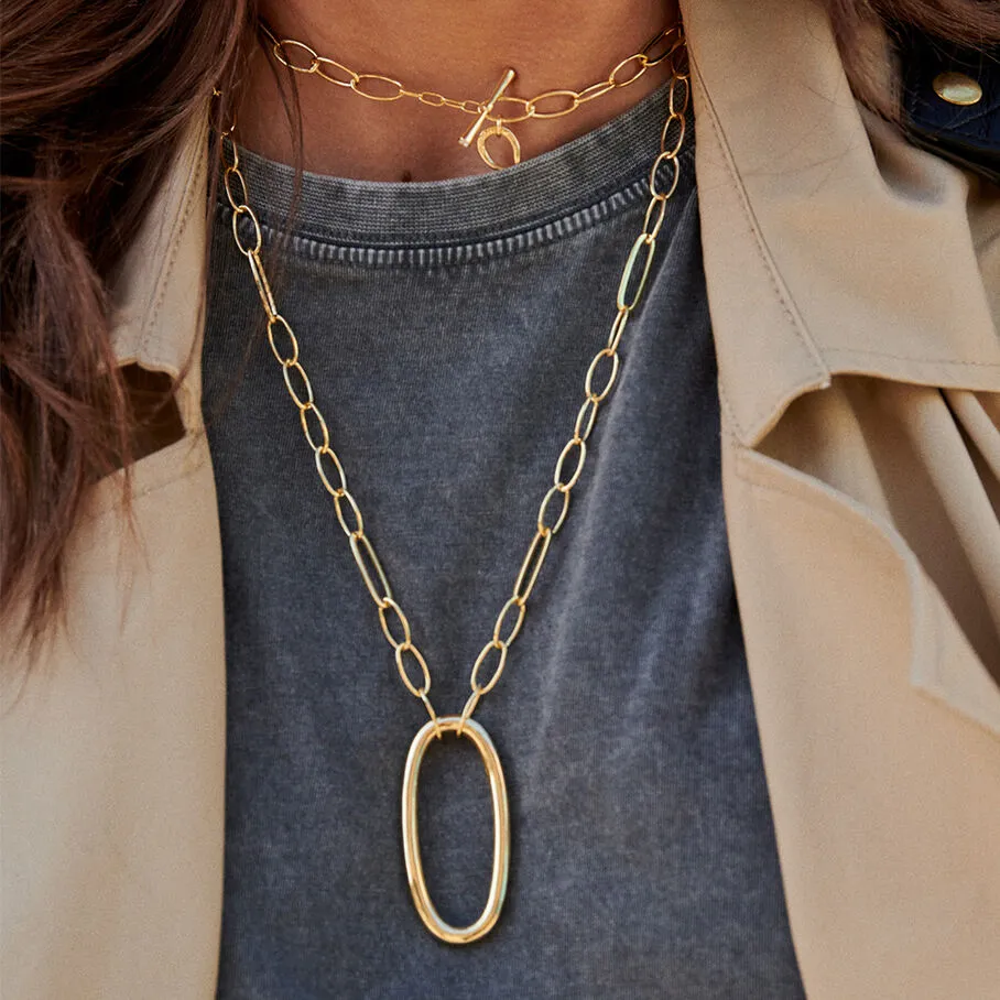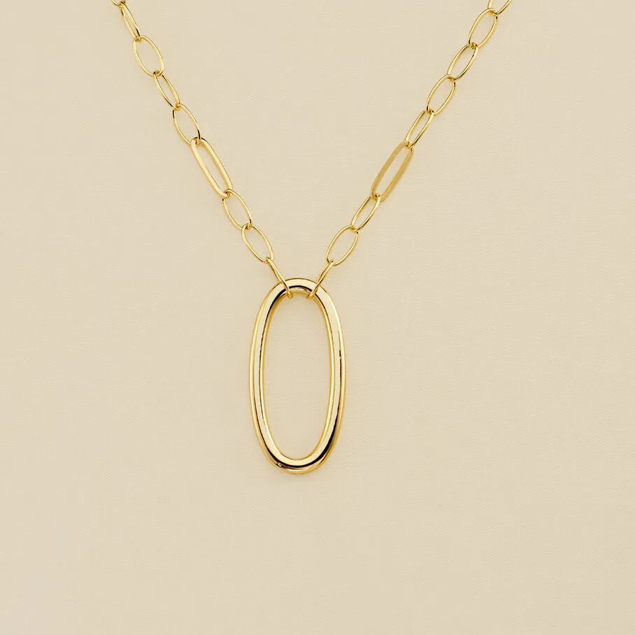 Sautoir, en laiton doré 750/1000, fait de maillons ovales allongés et dont l’un XL se porte en pendentif