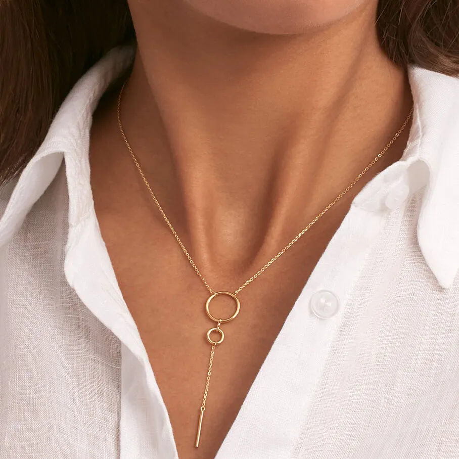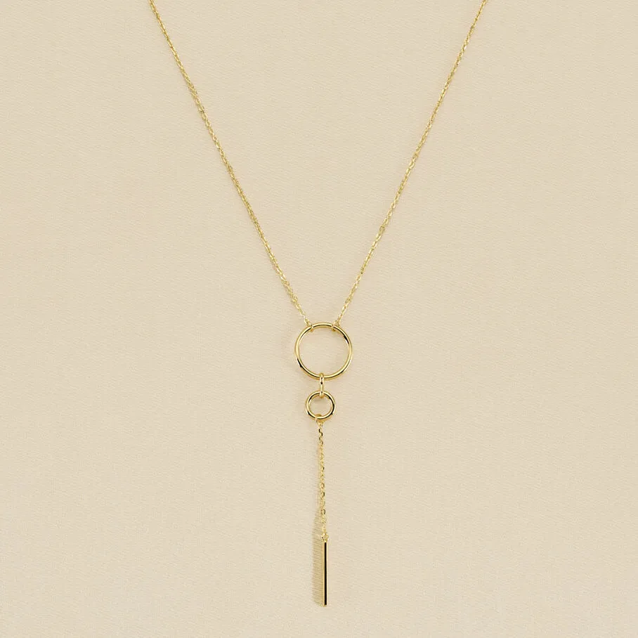Collier Y, en argent véritable doré 750/1000, avec une fine chaîne sur laquelle sont montés deux anneaux évidés de différentes tailles