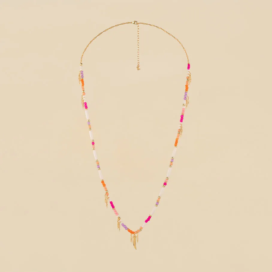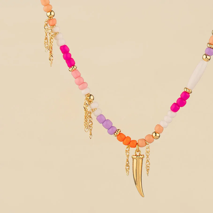 Collier long, en laiton doré 750/1000, perles de verre et en résine avec des franges en chaine et une corne en pendentif