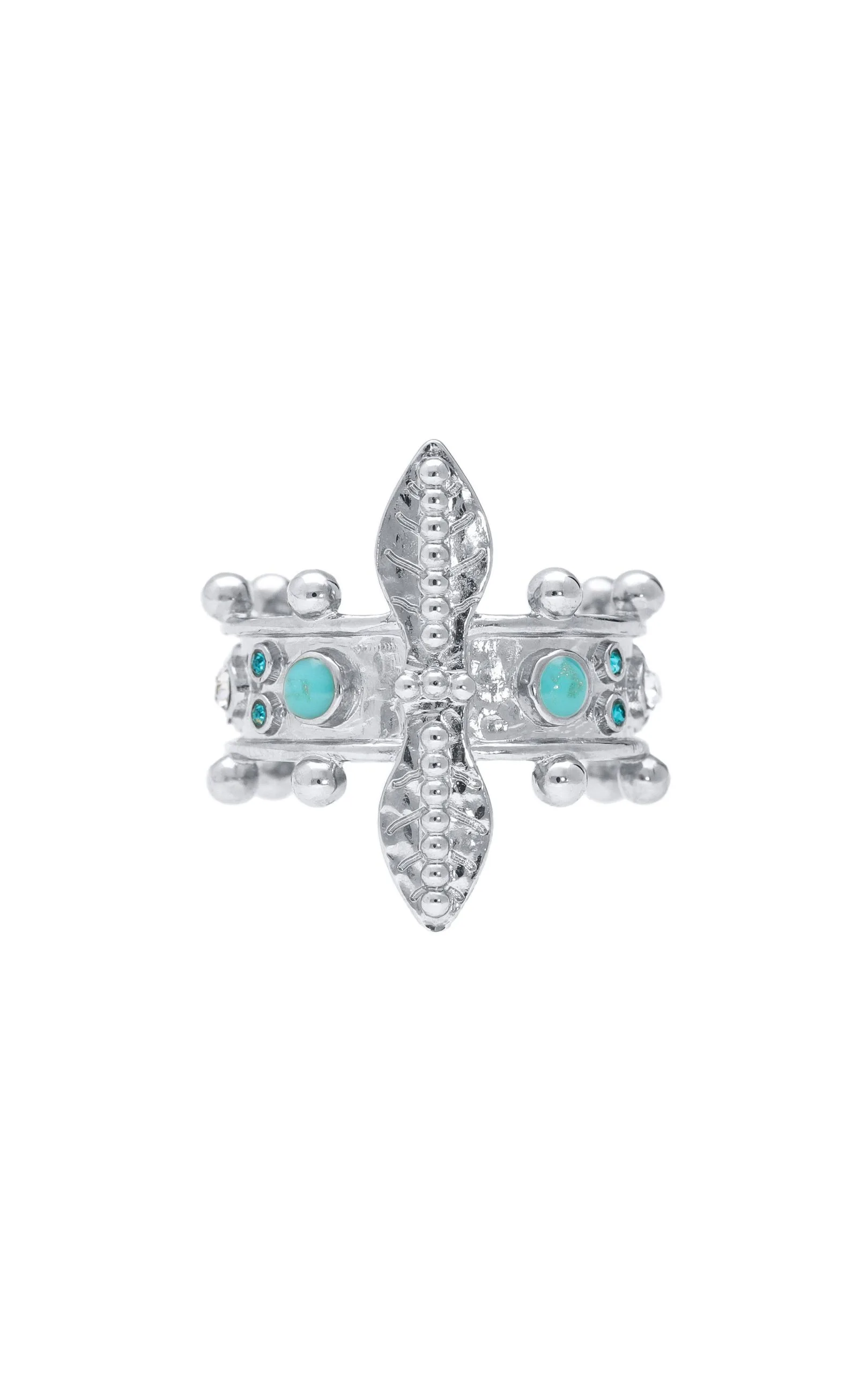 Cet hiver, vous allez raffoler de cette petite merveille précieuse! Cette bague en laiton argenté plaqué au palladium, 0,3 microns, à la particularité d’être amovible et s’adapte à toutes les tailles. Elle est décorée de petites billes argentées et de palmettes centrales qui rappellent les bijoux anciens de l’époque italienne. Elle est décorée de points d’émail turquoise et pavée de strass de couleur turquoise, blanc effet diamant et violet améthyste.