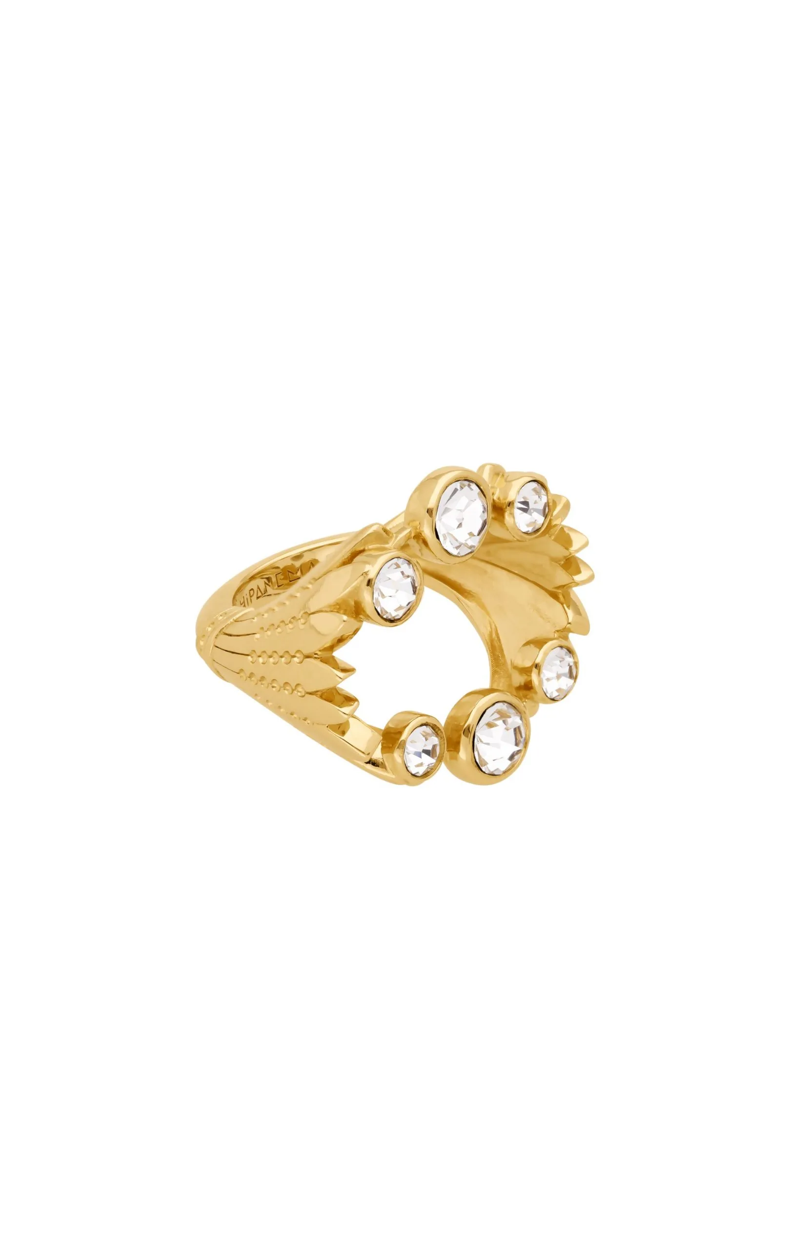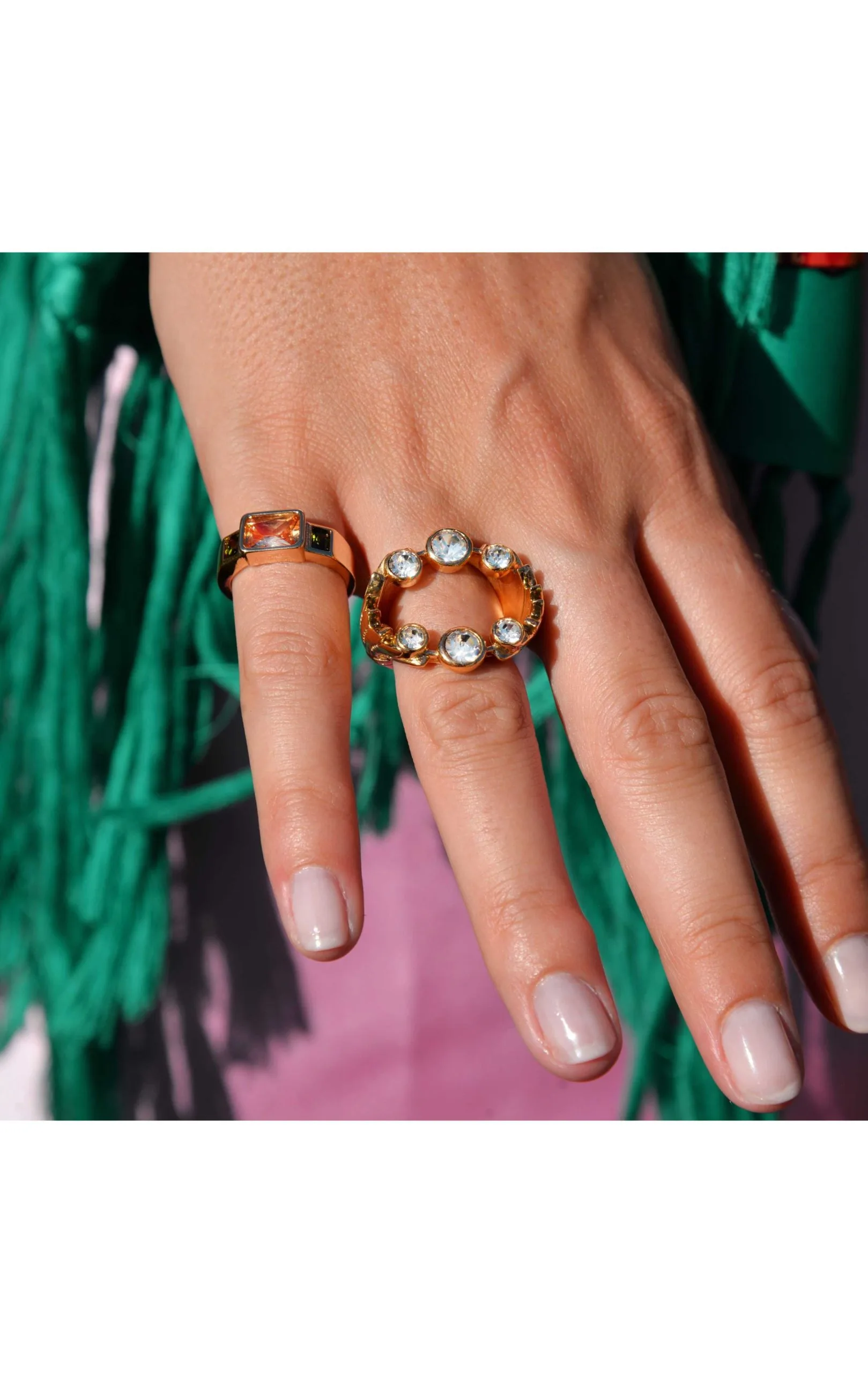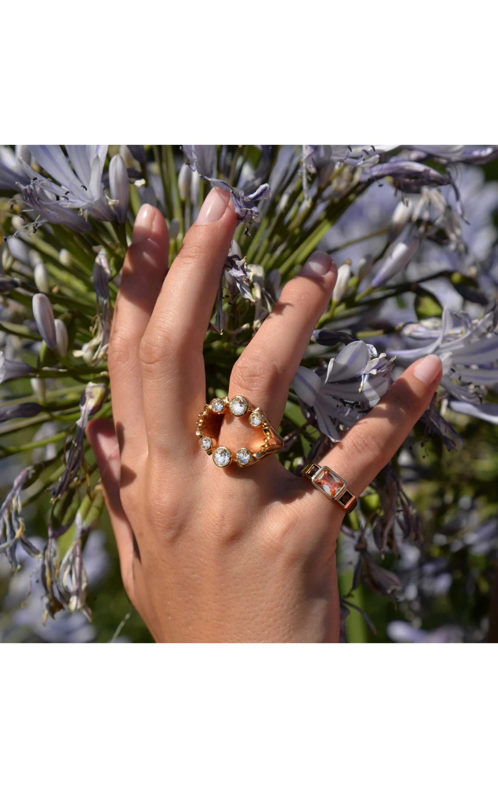 On adore cette bague à l’élégance ostentatoire, en laiton doré à l’or fin 14 carats. Le corps de bague très travaillé, évoque les bijoux antiques d’inspiration égyptienne, avec ses élégantes palmes ou fleurs stylisées. Le dessus de la bague, ajouré sur le doigt, est composé de six strass blancs effet diamant. Révélez la Cléopâtre qui sommeille en vous avec ce sublime bijou fait à la main.
