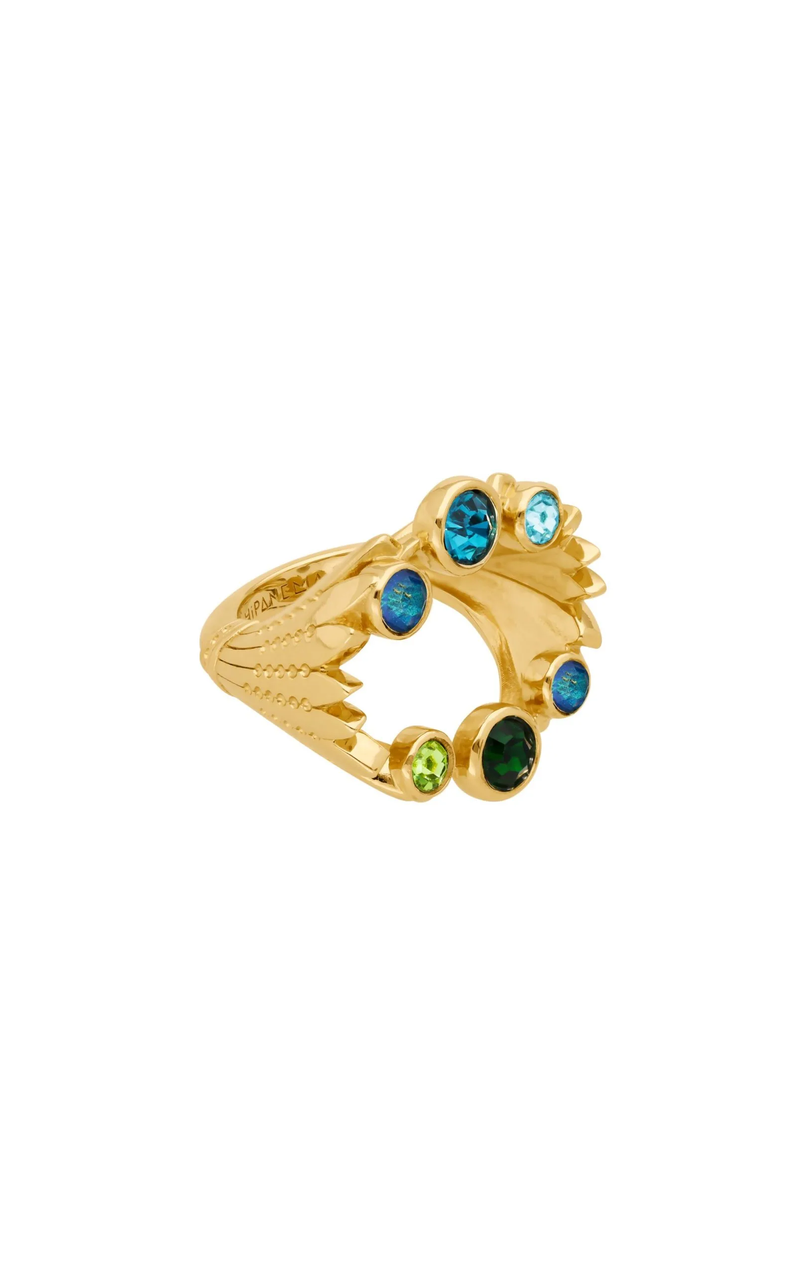 On adore cette bague à l’élégance ostentatoire, en laiton doré à l’or fin 14 carats. Le corps de bague très travaillé, évoque les bijoux antiques d’inspiration égyptienne, avec ses élégantes palmes ou fleurs stylisées. Le dessus de la bague, ajouré sur le doigt, est composé de six strass vert effet émeraude, bleu effet topaze Blue London, vert effet péridot. Révélez la Cléopâtre qui sommeille en vous avec ce sublime bijou fait à la main.