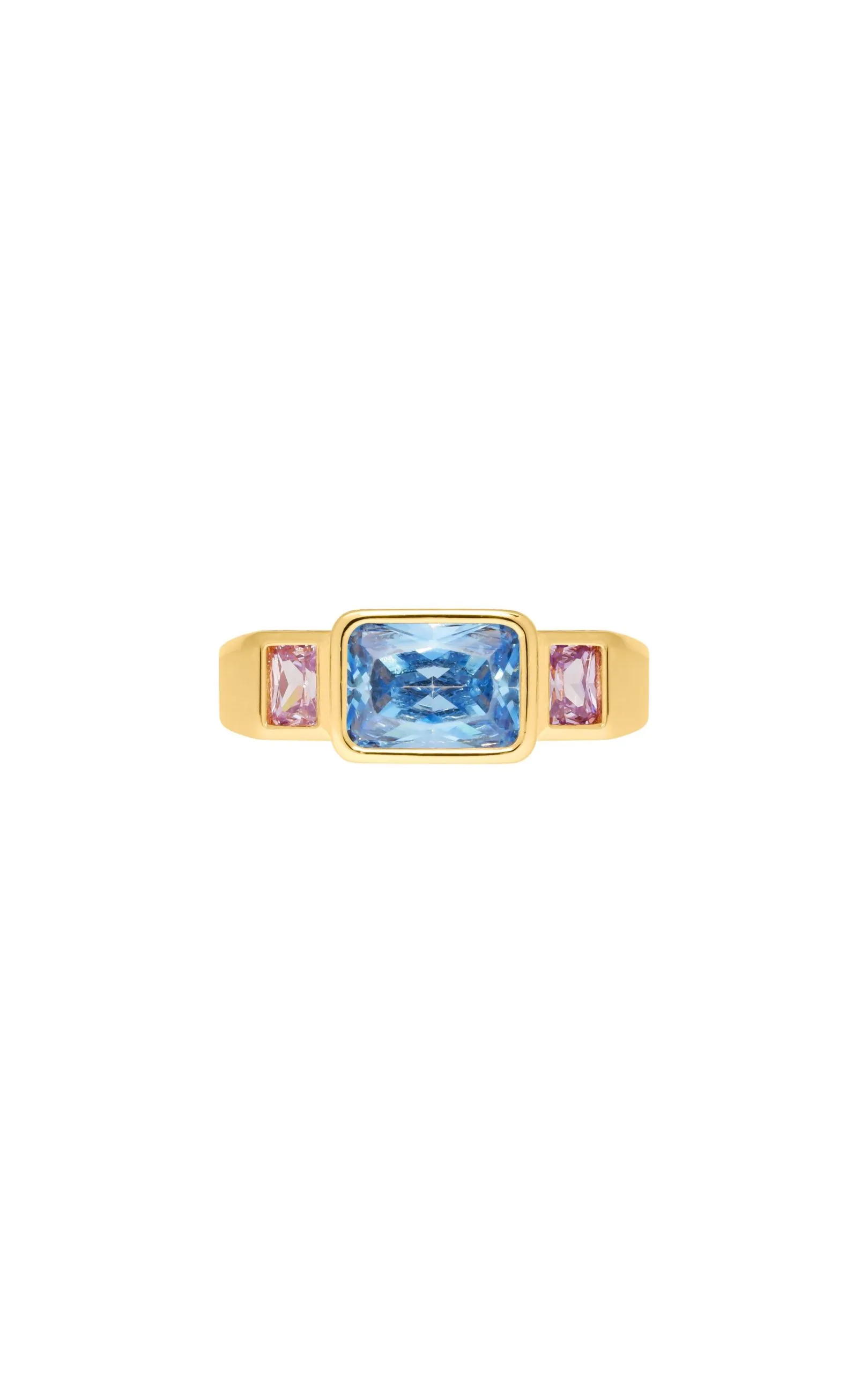 On file vers l’exubérance et on craque pour cette bague. Cette bague dorée ornée en son centre d’un strass bleu effet Aigue-marine, paré de chaque côté de deux strass violet effet améthyste. La pièce maîtresse pour un style ostentatoire chic, où l’on retrouve la douce folie d’Hipanema.