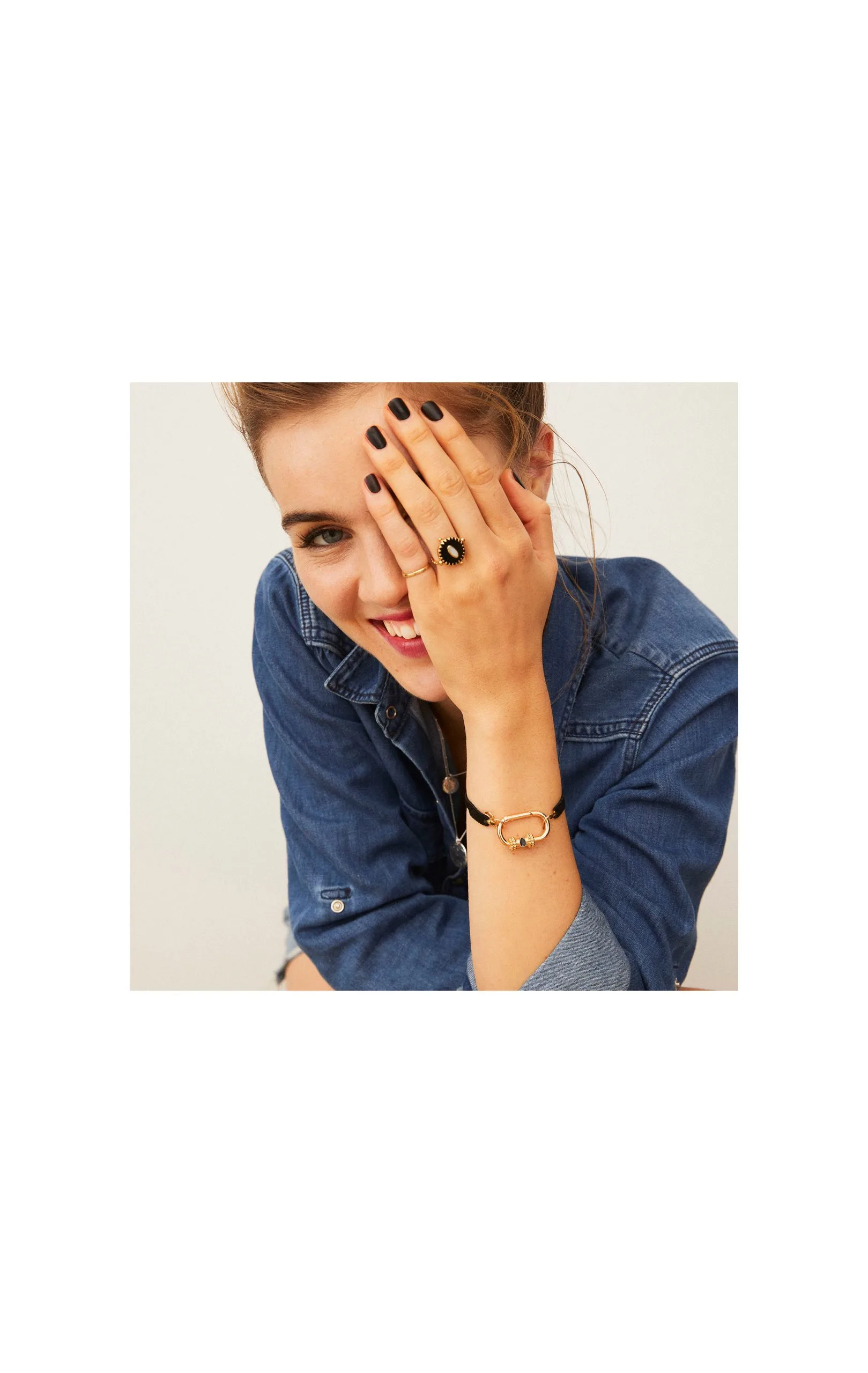 Fermoir mousqueton doré. Il est muni d’un écrou ouvragé et décoré d’une pampille goutte en cristal noir.