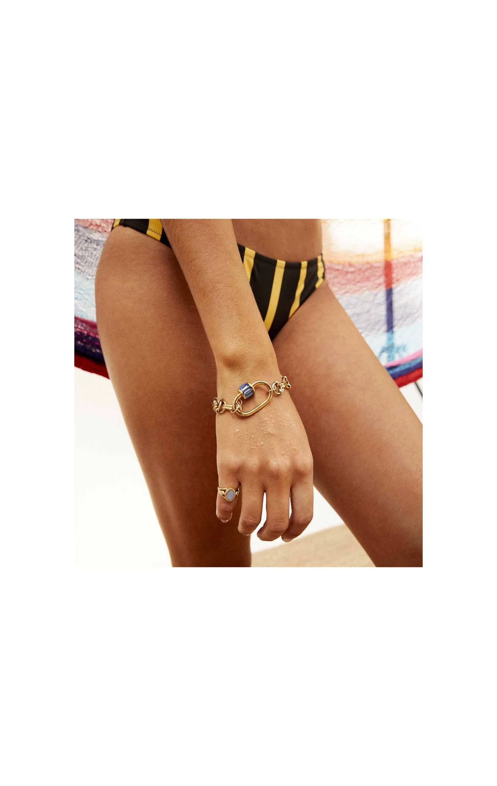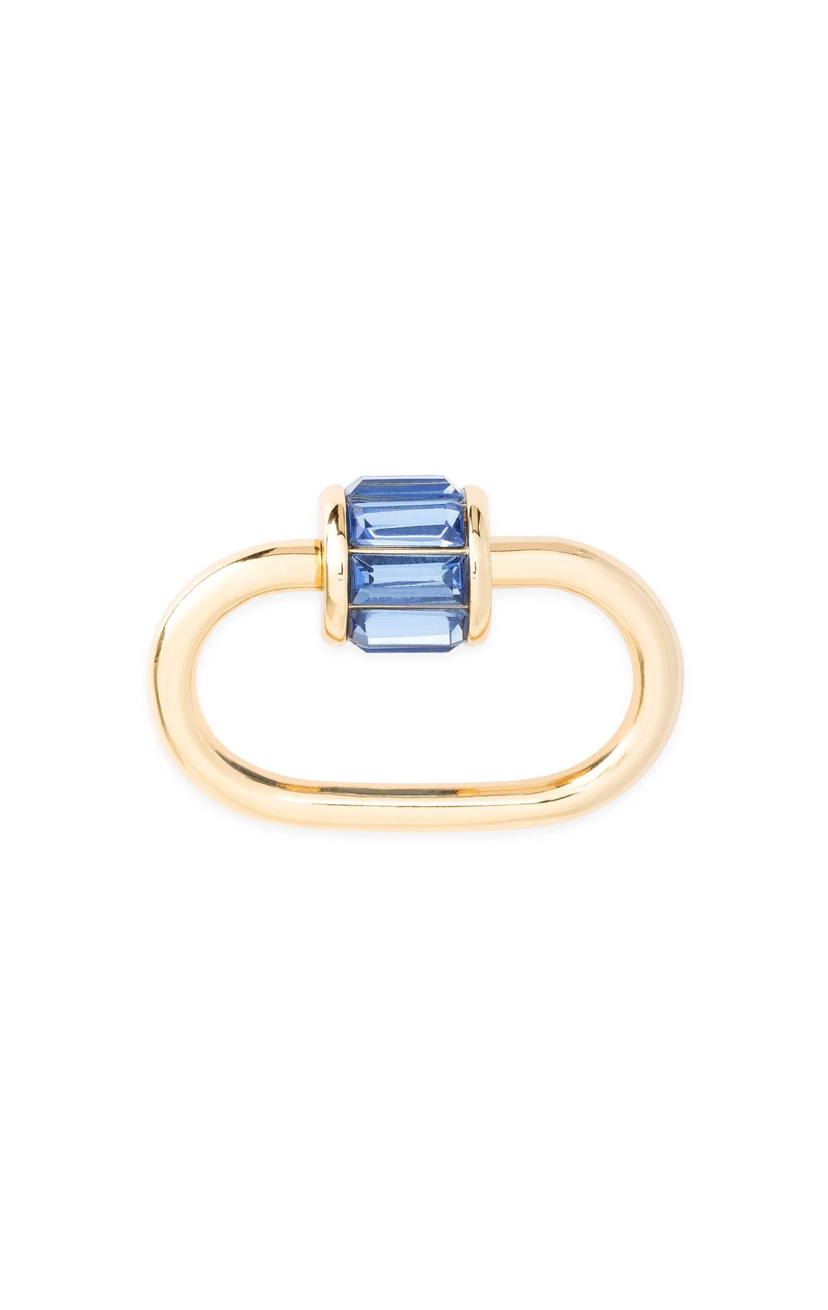 Le LOCKET « GIANT » est le plus grand des fermoirs mousqueton. Il est ici présenté en laiton plaqué à l’or fin 14 carats et le pas de vis orné de cristaux baguette bleu saphire.