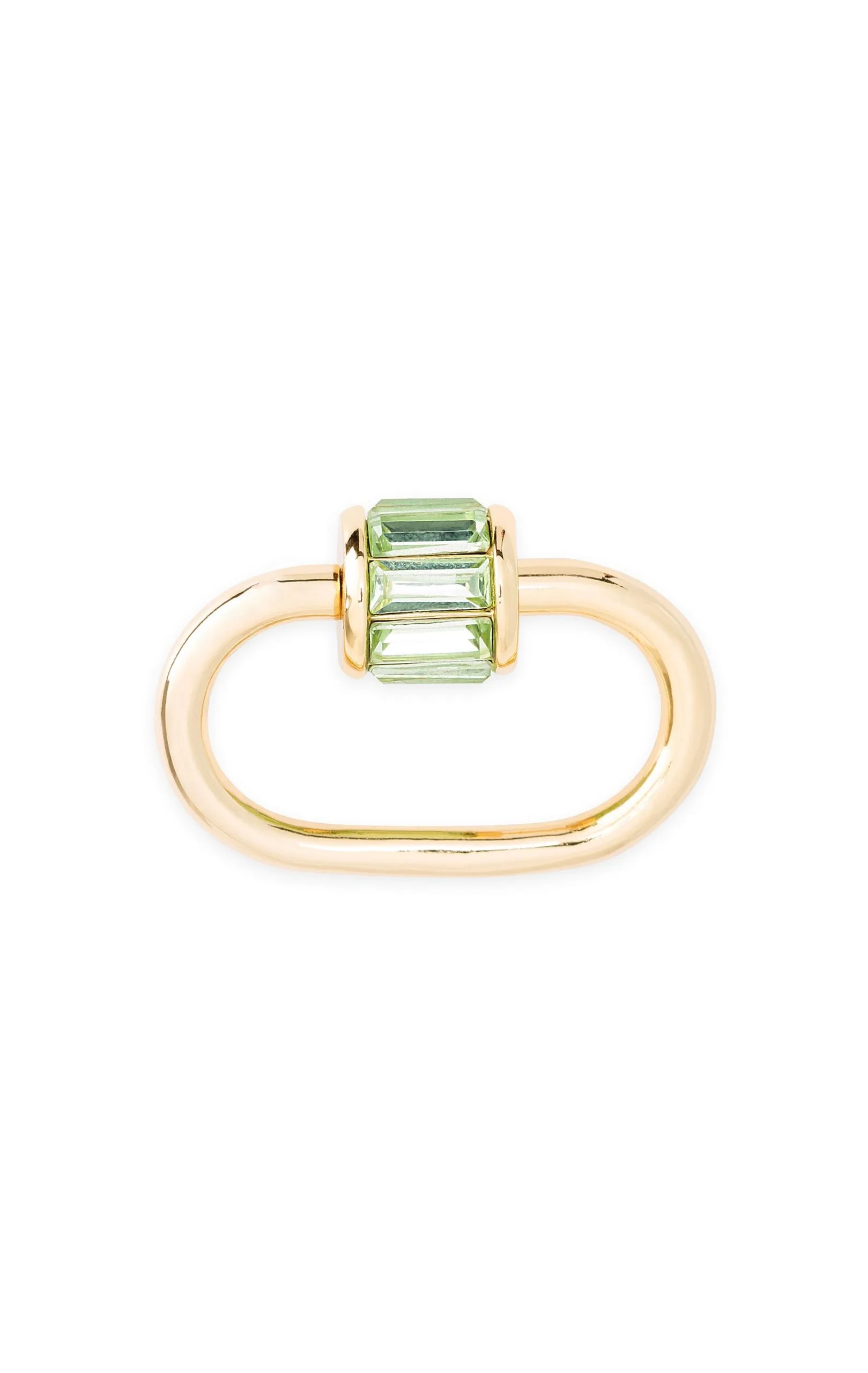 Le LOCKET « GIANT » est le plus grand des fermoirs mousqueton. Il est ici présenté en laiton plaqué à l’or fin 14 carats et le pas de vis orné de cristaux baguette vert jade.